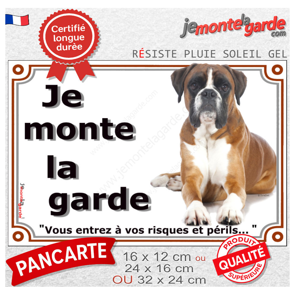 "Je monte la garde, vous entrez à vos risques et périls" avec un Boxer fauve marron en photo, cette plaque française de qualité résiste aux intempéries. Elle dissuade efficacement et ajoute une touche d'élégance à votre portail. Idée cadeau parfaite pour tout propriétaire de Boxer soucieux de sécurité.