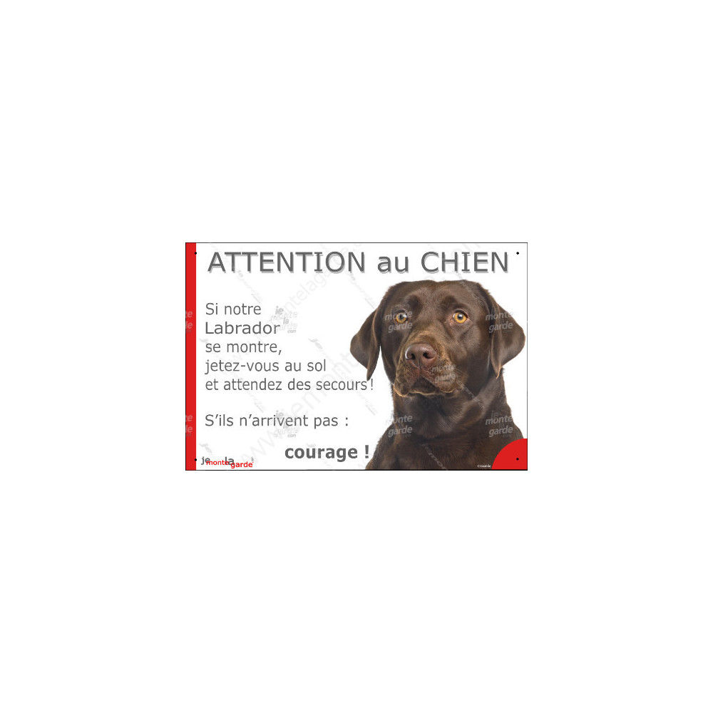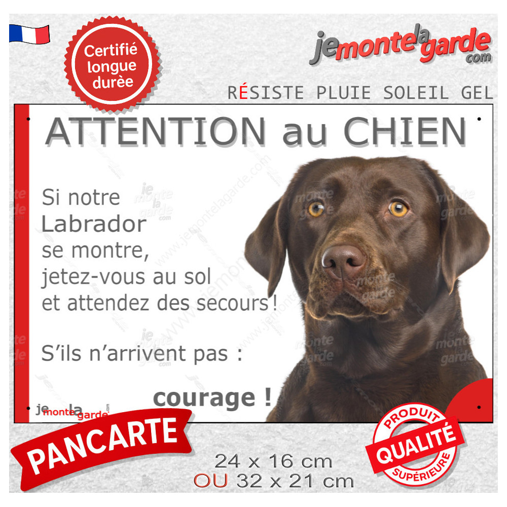 "Attention au chien : Si notre Labrador se montre, jetez-vous au sol et attendez des secours ! S'ils n'arrivent pas : courage !". Ce panneau humoristique avec la photo d'un Labrador Retriever marron chocolat, résistant au gel, au soleil et à la pluie, apporte une touche drôle tout en restant fonctionnel et durable.