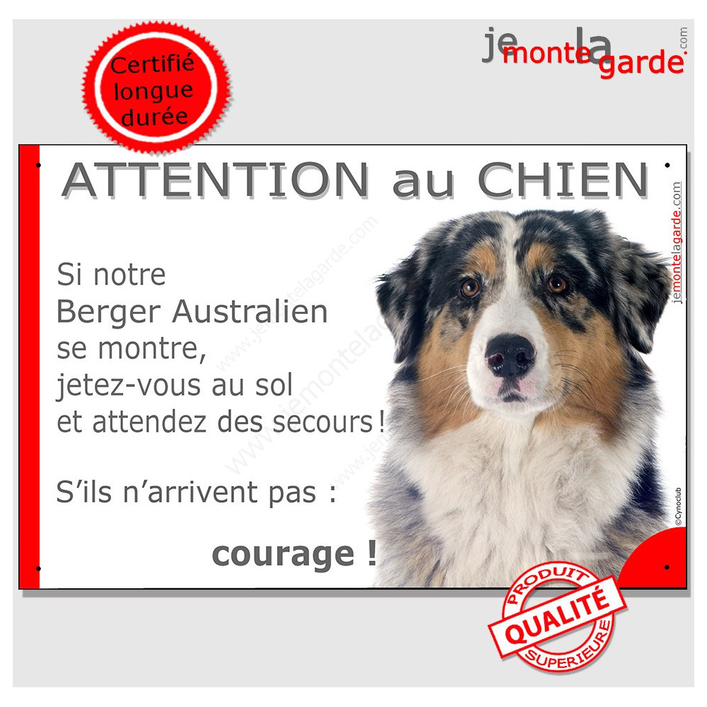 Panneau humoristique “Attention au chien : Si notre Berger Australien se montre, jetez-vous au sol et attendez des secours ! S’ils n’arrivent pas: courage !” avec photo d’un Aussie bleu merle. Fabrication française, lisible, résistante, et parfaite en idée cadeau.
