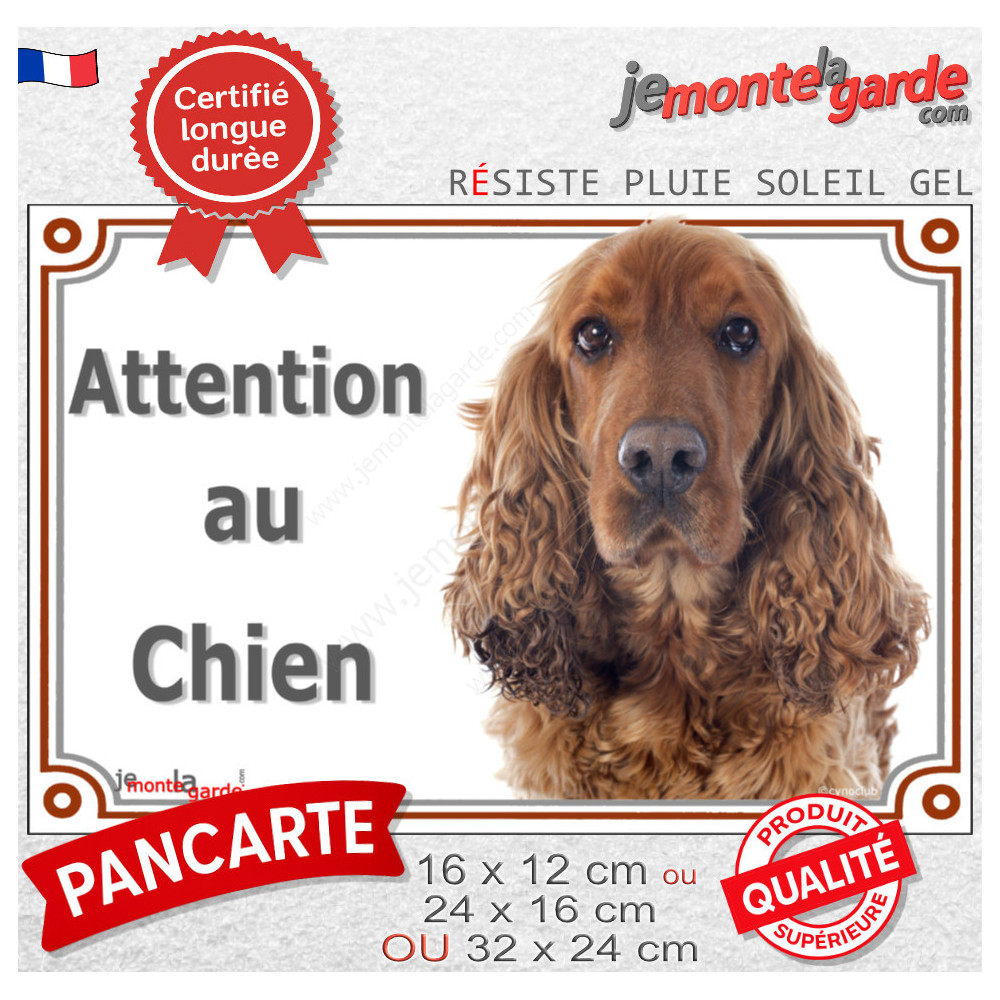 Vous cherchez une façon élégante, durable et charmante de signaler la présence de votre fidèle compagnon à 4 pattes ? Voici la pancarte "Attention au Chien" de qualité avec une photo d'un Cocker Anglais roux.