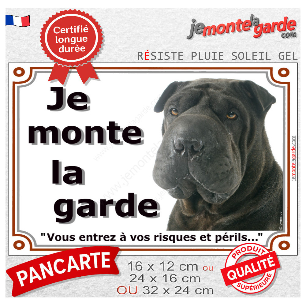 Plongez dans l'univers de la sécurité avec cette pancarte de portail "Je monte la garde, vous entrez à vos risques et périls", accompagnée d'une image captivante d'un Shar-Peï noir. Cette pancarte est bien plus qu'un simple avertissement, c'est une déclaration audacieuse de protection pour votre domicile.