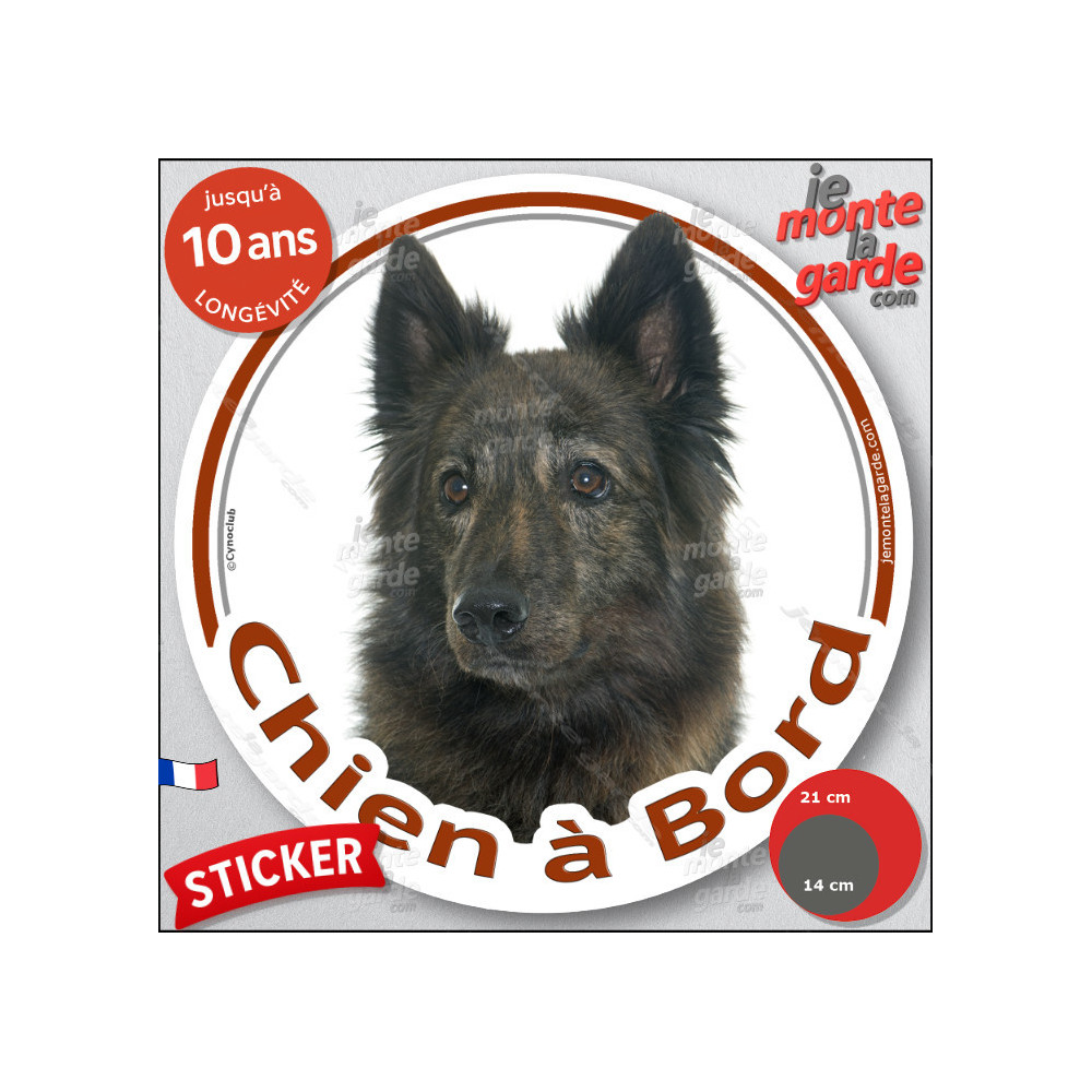 Sticker extérieur “Chien à Bord” avec un Berger Hollandais bringé à poils longs, clairement identifiable. Deux tailles : 14 cm pour voitures, 21 cm pour SUV et camping-cars. Résiste aux intempéries. Adhésif visible, lisible, durable. Fierté d’afficher son compagnon.