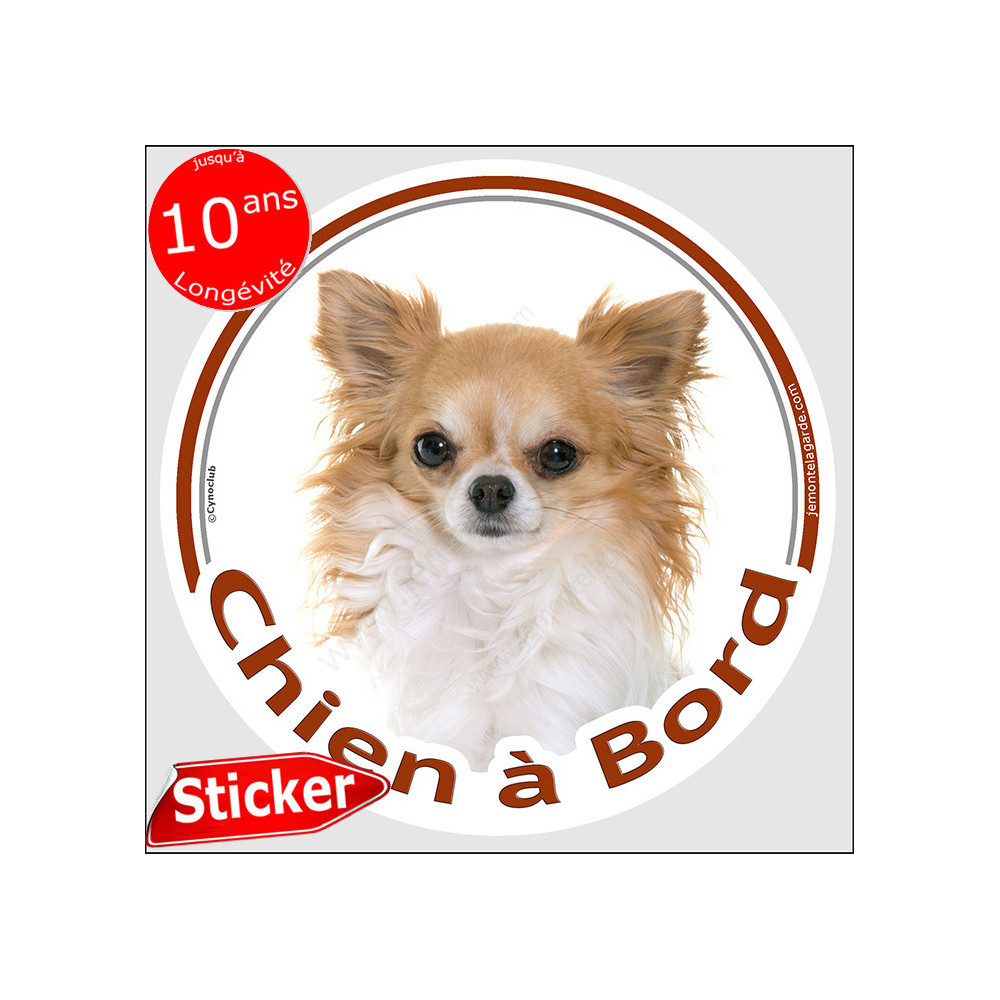 Un disque autocollant à coller à l'arrière de votre voiture pour prévenir de la présence de votre Chihuahua blanc et fauve poils longs.