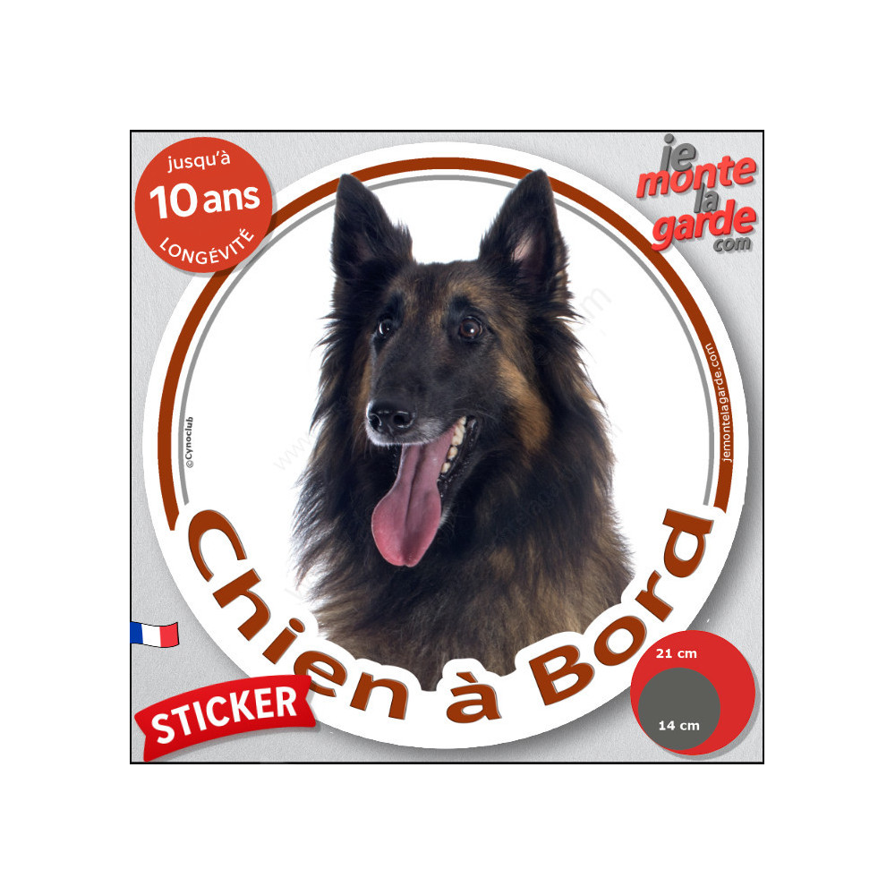 Sticker “chien à bord” avec photo d’un Berger Belge Tervueren noir et feu charbonné, résistant pluie, soleil et gel. Adhésif durable à poser à l’extérieur, sans bulles, idéal pour voitures, camping-cars ou SUV. Disponible en 14 ou 21 cm, il affiche votre fierté avec élégance et reste un joli clin d’œil pour tous les passionnés.