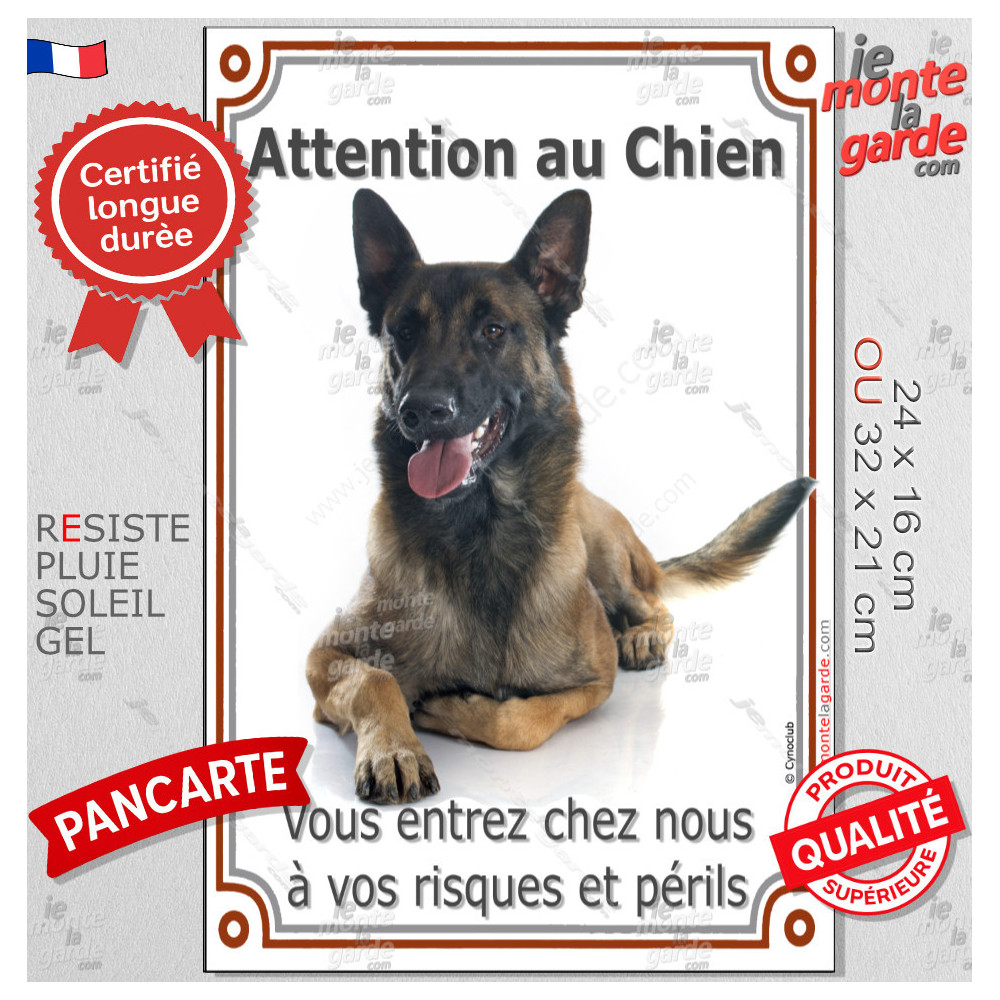 Le Berger Belge Malinois, race originaire de Belgique, est reconnu depuis le XIXe siècle pour ses qualités de chien de travail. Issu d’une sélection rigoureuse, il a été développé pour la garde, le troupeau et l’assistance. Son intelligence, son endurance, sa capacité d’adaptation et sa loyauté font de lui un compagnon recherché par les maîtres investis et vigilants. C’est aussi l’un des chiens les plus utilisés dans les services de sécurité, ce qui renforce l’impact d’une pancarte portant son image. Un visiteur hésitant, en croisant ce regard précis et intense, comprendra immédiatement qu’il entre sur un terrain où la vigilance règne.