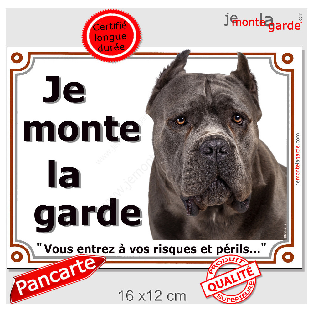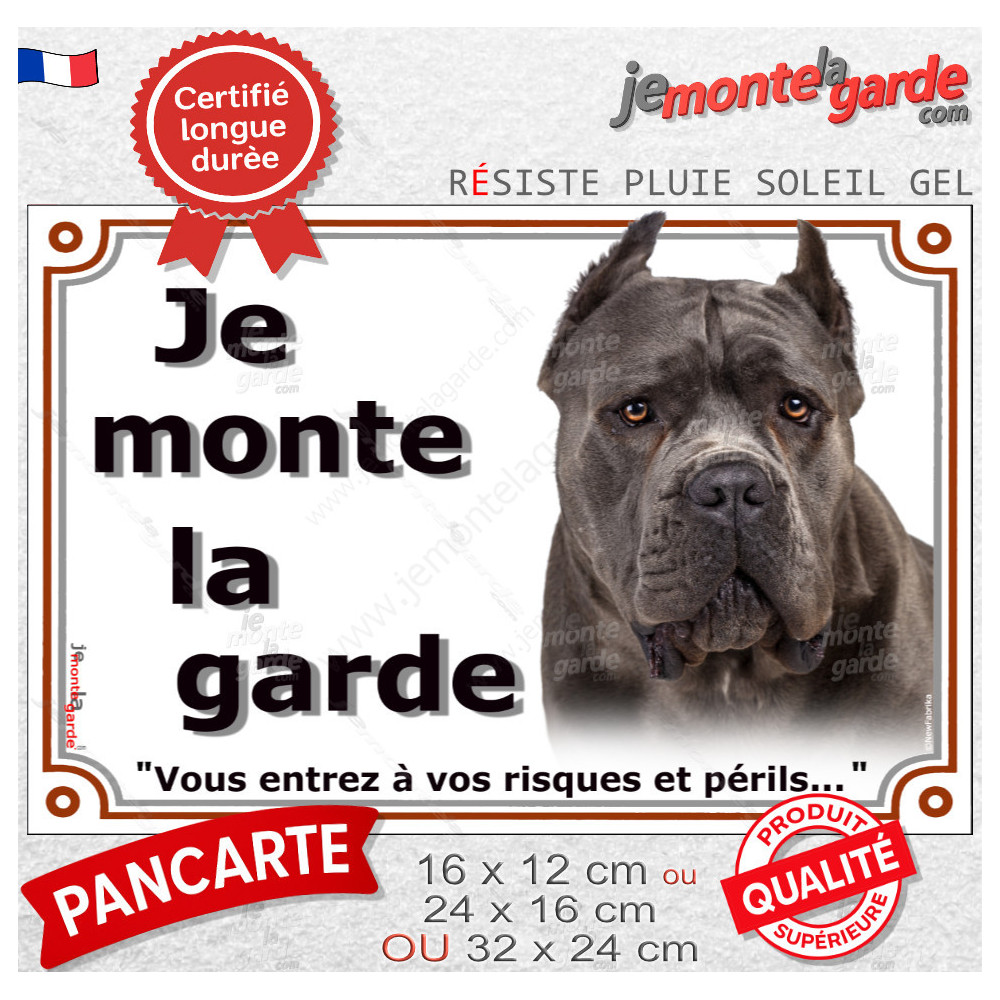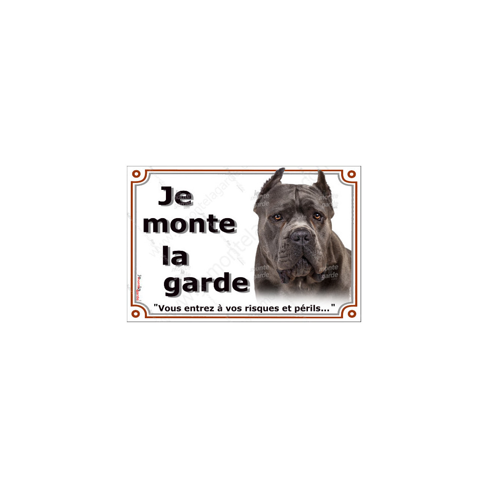 Pancarte "Je monte la garde, vous entrez à vos risques et périls" avec un Cane Corso gris bleu avec les oreilles coupées. Ajoute sécurité et élégance à votre portail. Fabriquée en France, résiste aux intempéries, dissuade les intrus. Idéale comme cadeau, apporte touche de fierté et protection à votre domicile.