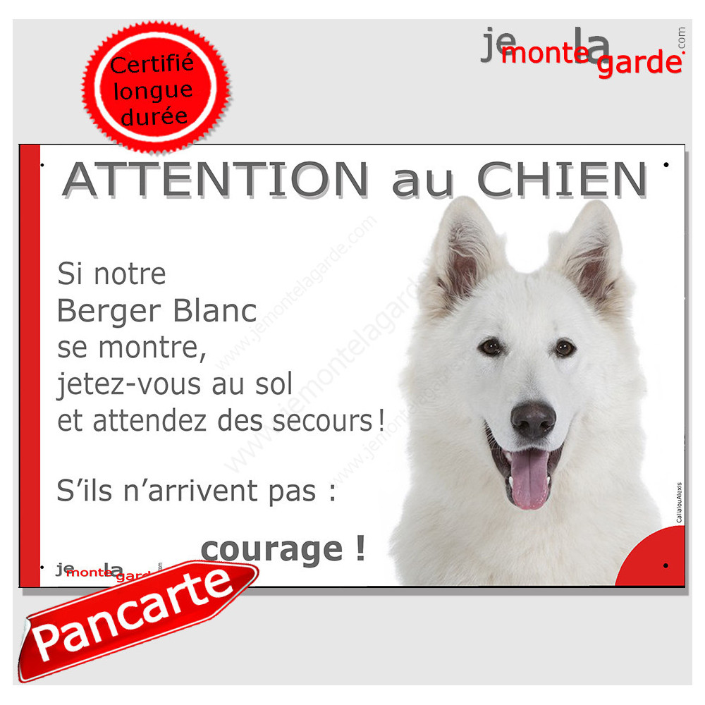 Plaque humoristique “ATTENTION au CHIEN – Si notre Berger Blanc se montre, jetez-vous au sol et attendez des secours ! S’ils n’arrivent pas : courage !” avec un Berger Blanc Suisse expressif, imprimée en France, lisible de loin, pour protéger avec humour votre portail en affichant votre compagnon.