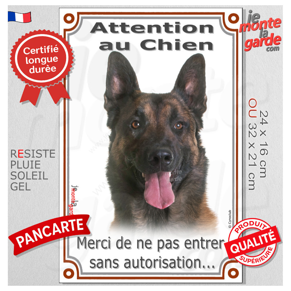 Panneau vertical “Attention au Chien, merci de ne pas entrer sans autorisation” avec Berger Belge Malinois. Plaque résistante aux intempéries, idéale pour poteau ou entrée étroite. Affichage dissuasif, utile pour prévenir les intrusions tout en laissant planer un doute très efficace.