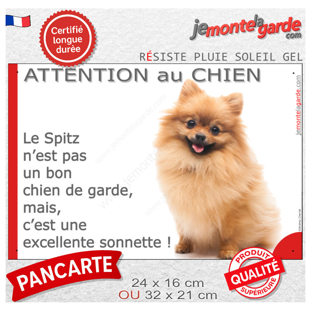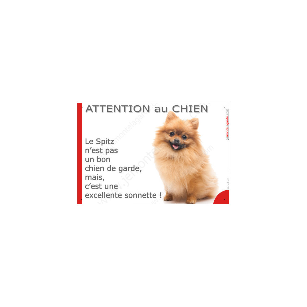 Panneau de portail qui combine malice, tendresse et efficacité, cette affiche “Attention au Chien - Notre Spitz n’est pas un bon chien de garde, mais c’est une excellente sonnette !” trouve instantanément sa place sur une entrée. Le message amuse dès la première lecture tout en installant, en quelques mots, un ton complice et un brin piquant. La formule joue sur l’image connue du Spitz, chien miniature au pelage abondant et à l’énergie débordante, pour annoncer à tous que ce petit compagnon, même sans mordant impressionnant, saura alerter la maisonnée comme il se doit. Une sonnette vivante et pleine de panache.