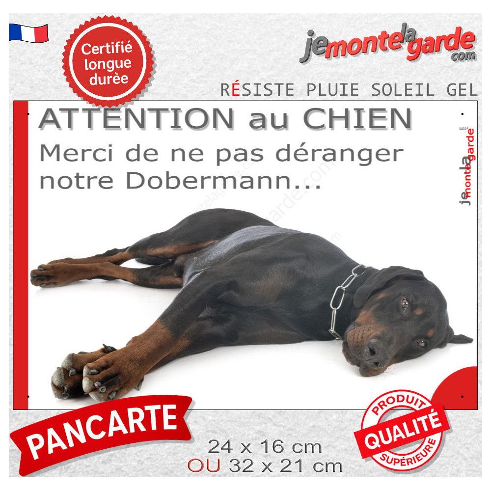 Vous avez souvent l'impression que la sonnette réveille votre Dobermann ? Installez cette pancarte de portail pour préserver ses siestes mais quand même avertir avec ce panneau plein d'humour, qu'ici il y a un chien de garde qui surveille la maison !