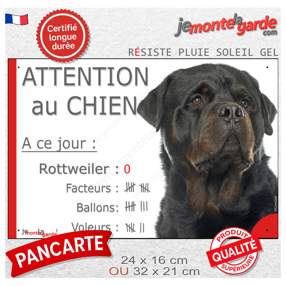 Panneau humoristique “Attention au Chien, à ce jour : Nombre de Rottweiler, Nombre de voleurs, Nombre de facteurs, Nombre de ballons”, avec photo d’un Rottweiler noir à marques feu adoucies. Fabrication française, matériau et encres résistants à la pluie, au soleil et au gel. Plaque drôle, efficace et durable, parfaite pour marquer les esprits sans agressivité.