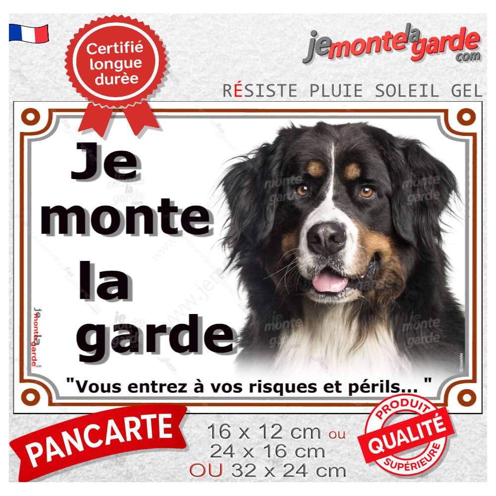 Plaque portail “Je monte la garde, vous entrez à vos risques et périls” au design clair et lisible, fabriquée en France dans un matériau durable qui résiste à la pluie, au soleil et au gel. Le Bouvier Bernois tricolore et son regard calme, incarne la vigilance d’un gardien fidèle et la fierté d’un foyer protégé.