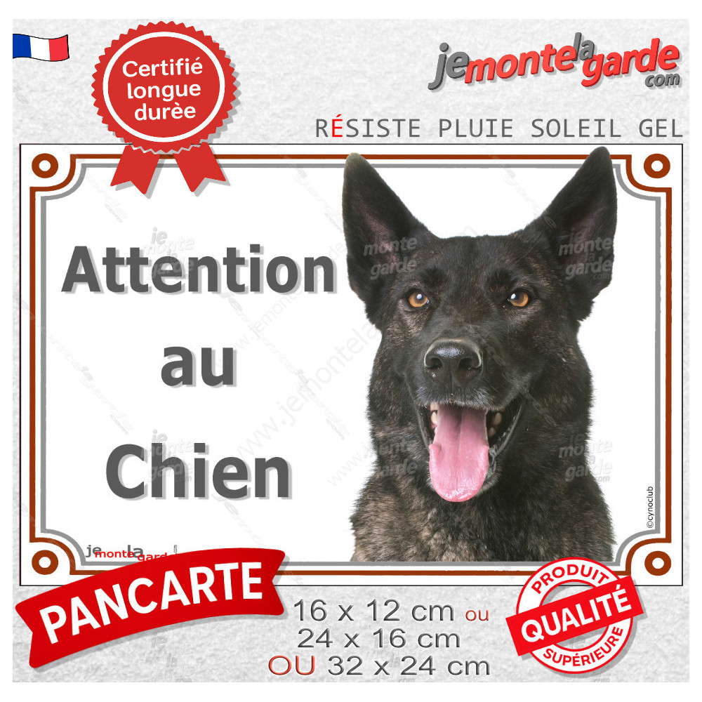 Panneau “Attention au Chien” avec photo d’un Berger Hollandais bringé à poils courts. Fabriquée en France, cette plaque résistante à la pluie, au soleil et au gel allie dissuasion tranquille, mise en garde polie et signal clair sans agressivité ni menace.