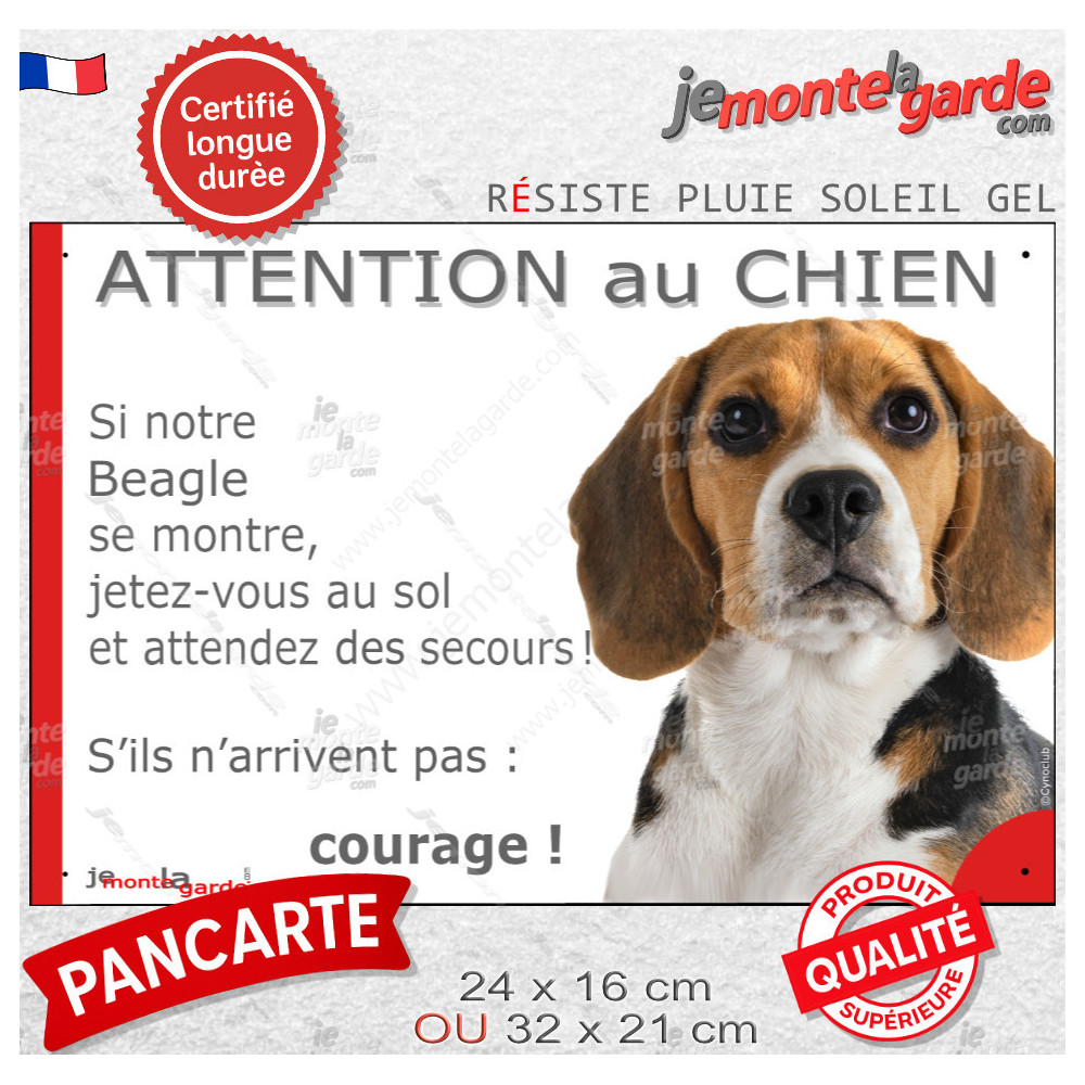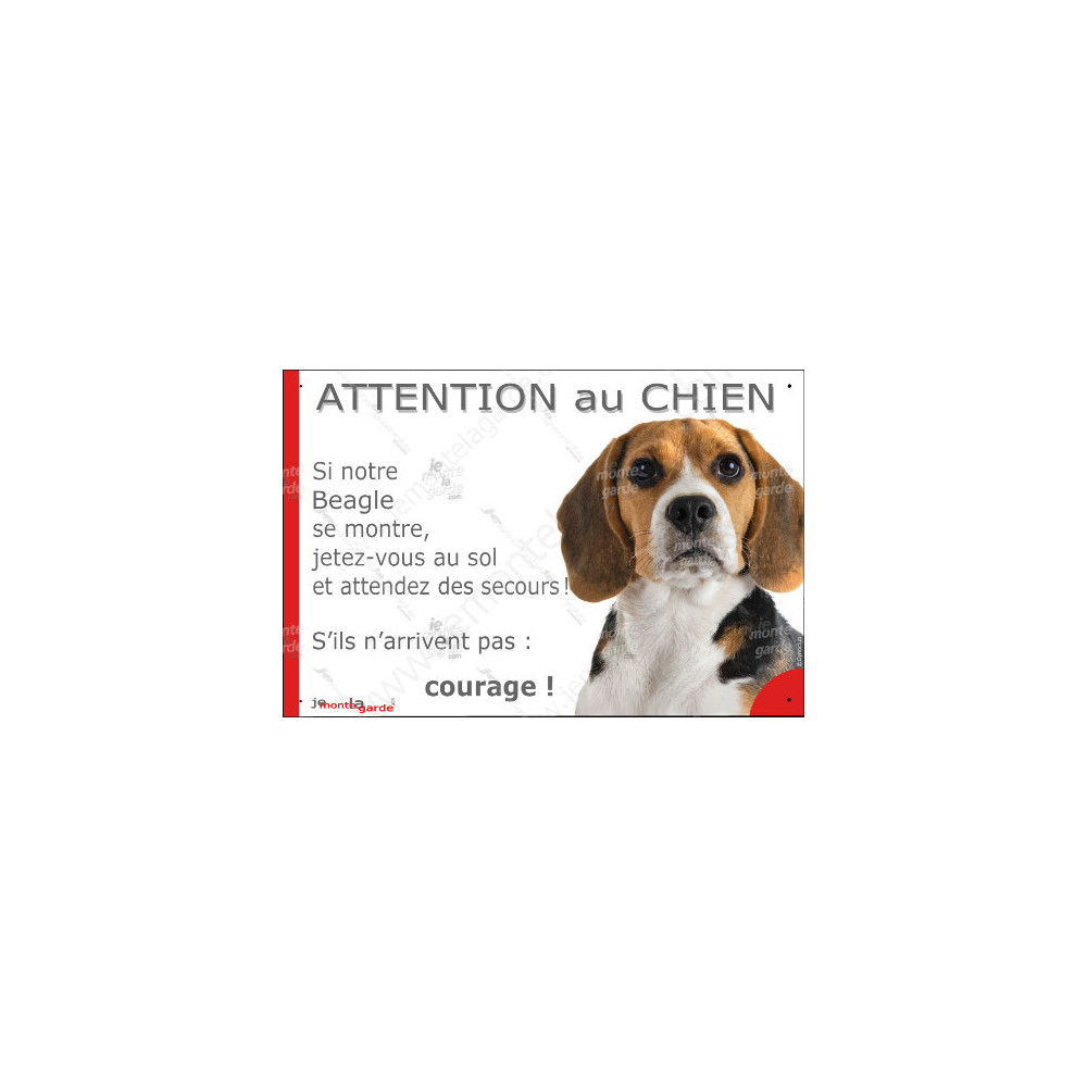 Panneau Beagle tricolore « Attention au chien : Si notre Beagle se montre, jetez-vous au sol et attendez des secours ! S’ils n’arrivent pas: courage ! ». Résiste intempéries, fabriqué en France, signale la présence du chien. Utile pour la sécurité, marque les limites de la propriété avec touche amusante.