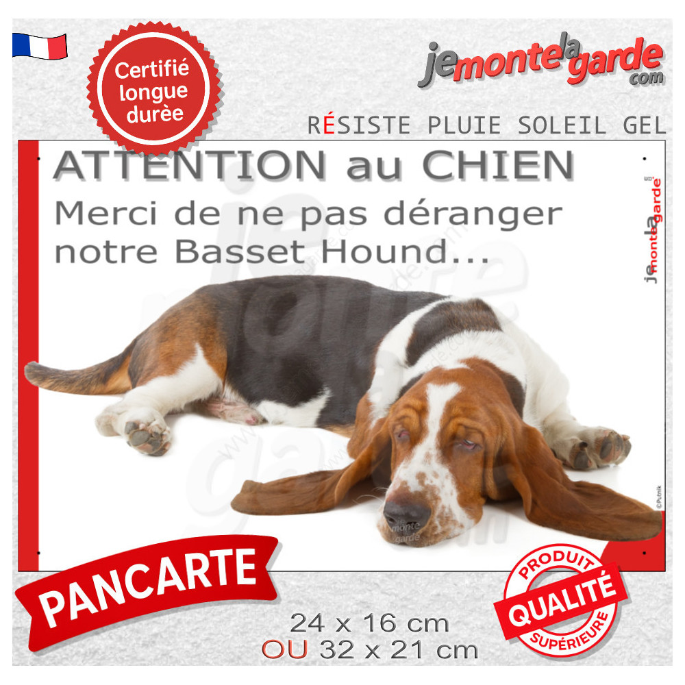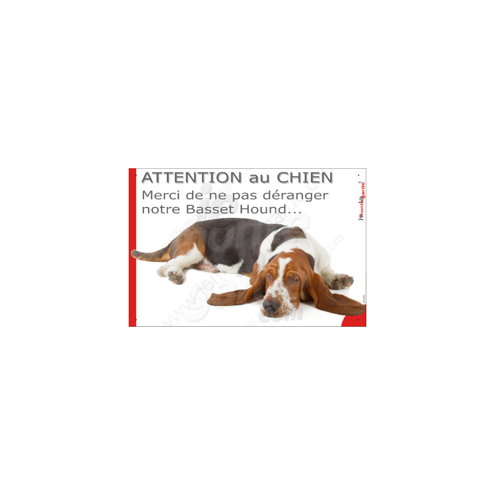 Pancarte “ATTENTION au CHIEN – Merci de ne pas déranger notre Basset Hound…” avec photo d’un beau tricolore endormi. Plaque humoristique, résistante aux intempéries, idéale pour faire sourire les visiteurs tout en rappelant gentiment que le chien veille… à sa manière.