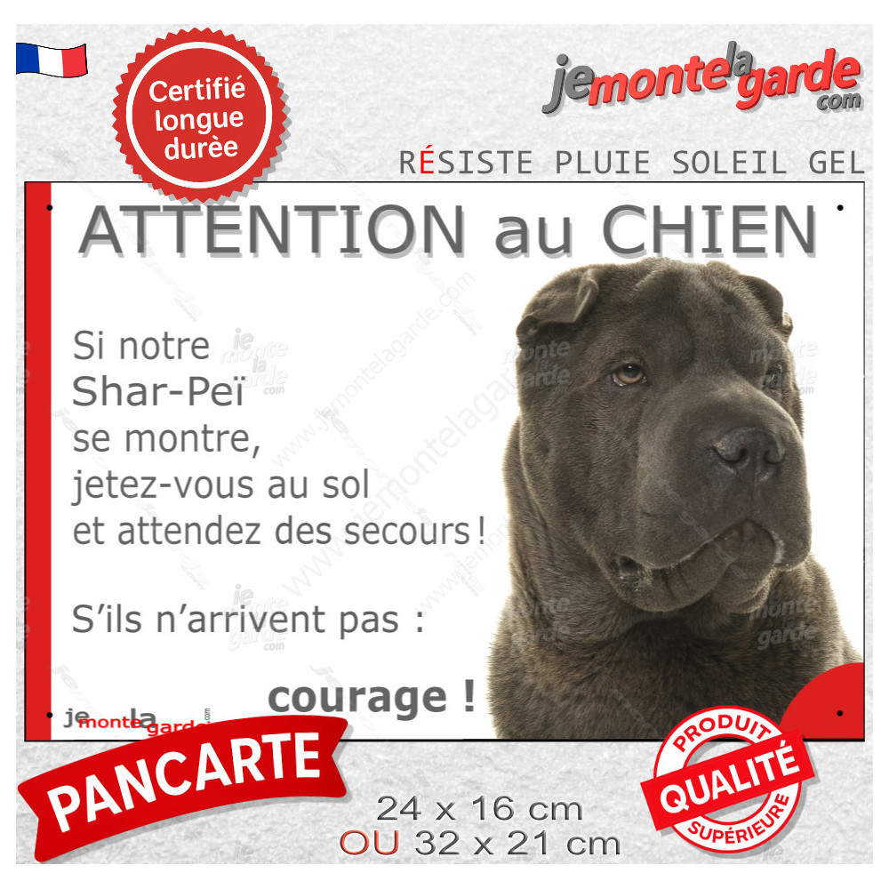 Sous ses airs froissés et sa démarche tranquille se cache un gardien qui préfère impressionner à sa façon. La plaque “Attention au chien : Si notre Shar-Peï se montre, jetez-vous au sol et attendez des secours ! S’ils n’arrivent pas : courage !” envoie un message clair aux visiteurs tout en déclenchant quelques sourires nerveux. Fabriquée en France, cette pancarte allie qualité et durabilité. Résistante aux intempéries, elle ne craint ni la pluie, ni le soleil, ni le gel, évitant ainsi les remplacements fréquents imposés par les produits bas de gamme.