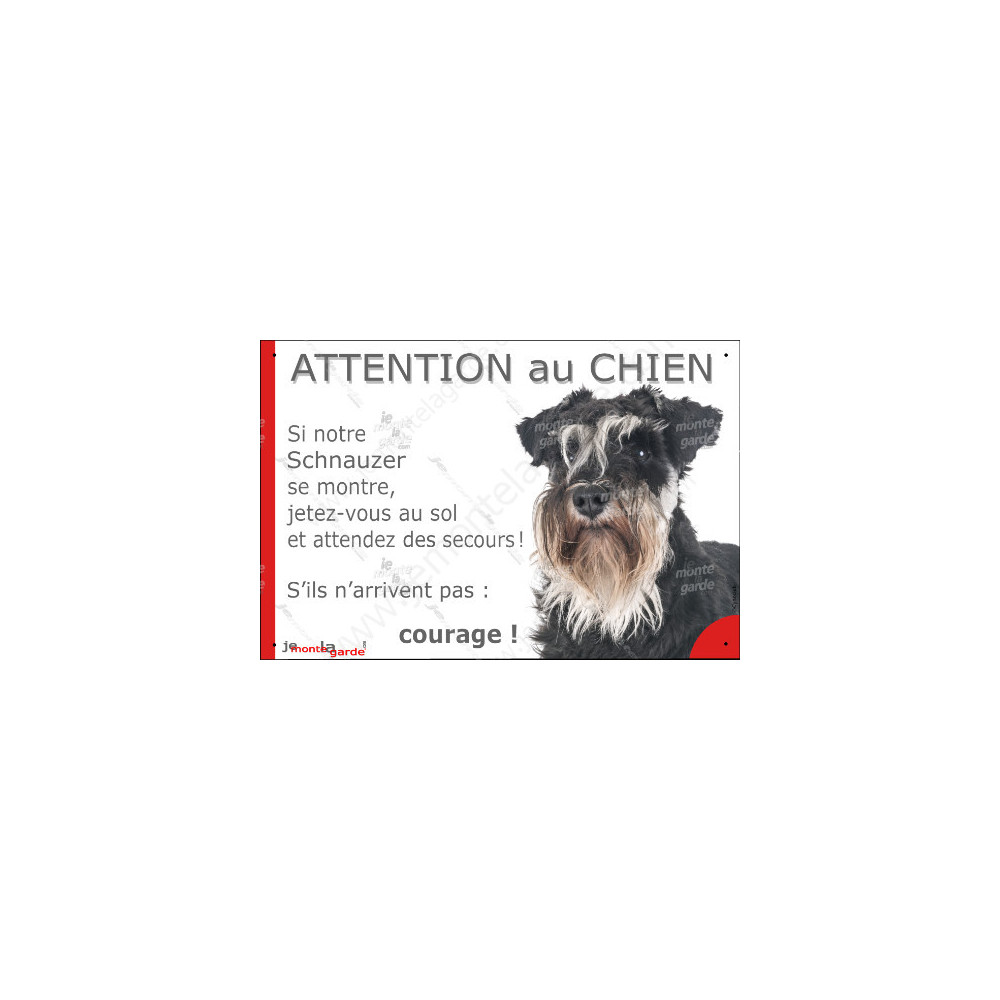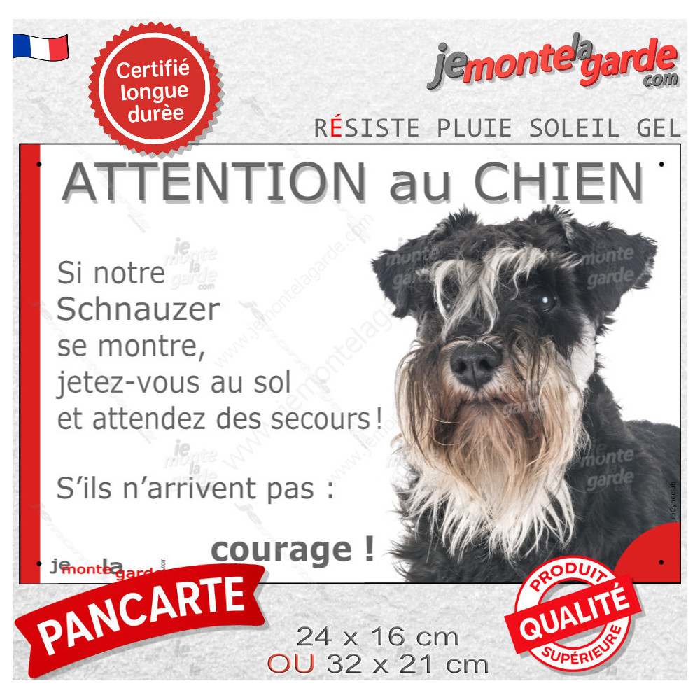 Panneau drôle et dissuasif avec photo d’un Schnauzer noir et argenté et le texte “ATTENTION au CHIEN : Si notre Schnauzer se montre, jetez-vous au sol et attendez des secours ! S’ils n’arrivent pas : courage !”. Fabrication française résistante au gel, au soleil et à la pluie.