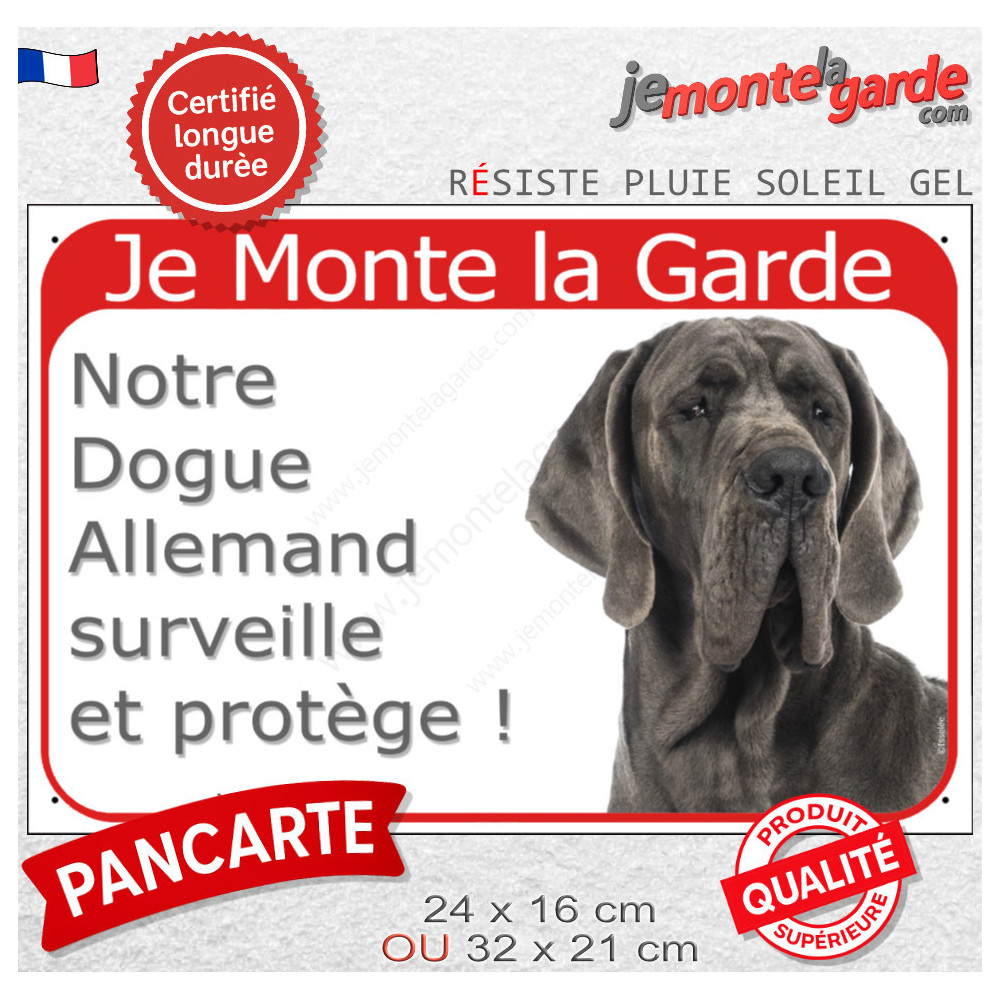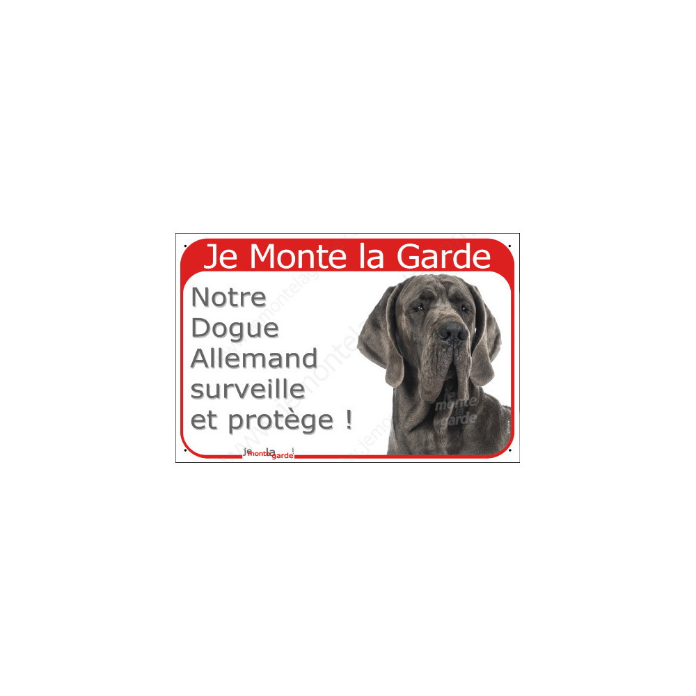 Pancarte rouge “Je monte la garde, Notre Dogue Allemand, surveille et protège !a avec la photo d’un Dogue Allemand gris bleu, visibilité et dissuasion. Résistante aux intempéries, elle valorise cette race en sécurisant votre propriété avec élégance.
