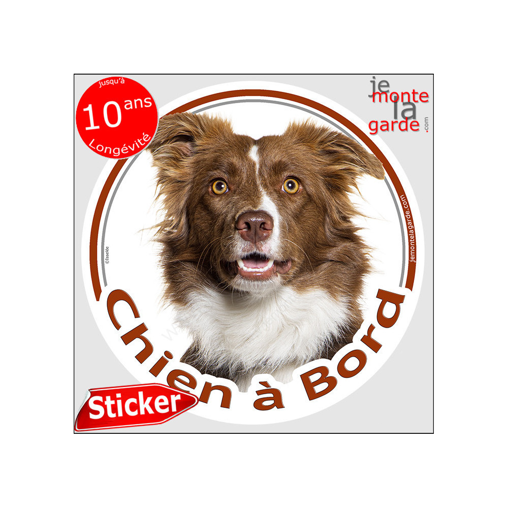 Voici donc l'accessoire indispensable pour tout amateur de cette race pleine de tempérament : ce sticker "chien à bord", mettant en vedette un magnifique Border Collie marron chocolat et blanc à poils longs. Il résiste vaillamment aux assauts du temps, bravant la pluie, le soleil et même le gel avec une dignité inébranlable.