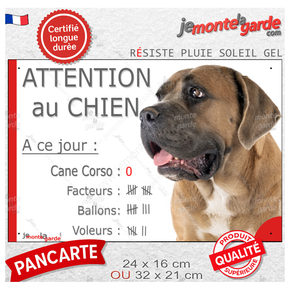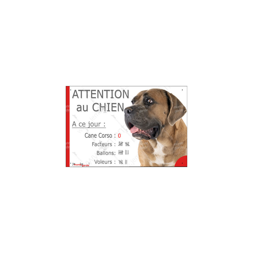 Pancarte humour “ATTENTION au CHIEN – À ce jour : Cane Corso : 0 – Facteurs : 10 – Ballons : 8 – Voleurs : 7”, claire, lisible et durable. Clin d’œil amusant et dissuasif. Le Cane Corso fauve au masque noir veille, statistique à l’appui. Idéal pour alerter en douceur et faire sourire ceux qui osent approcher.
