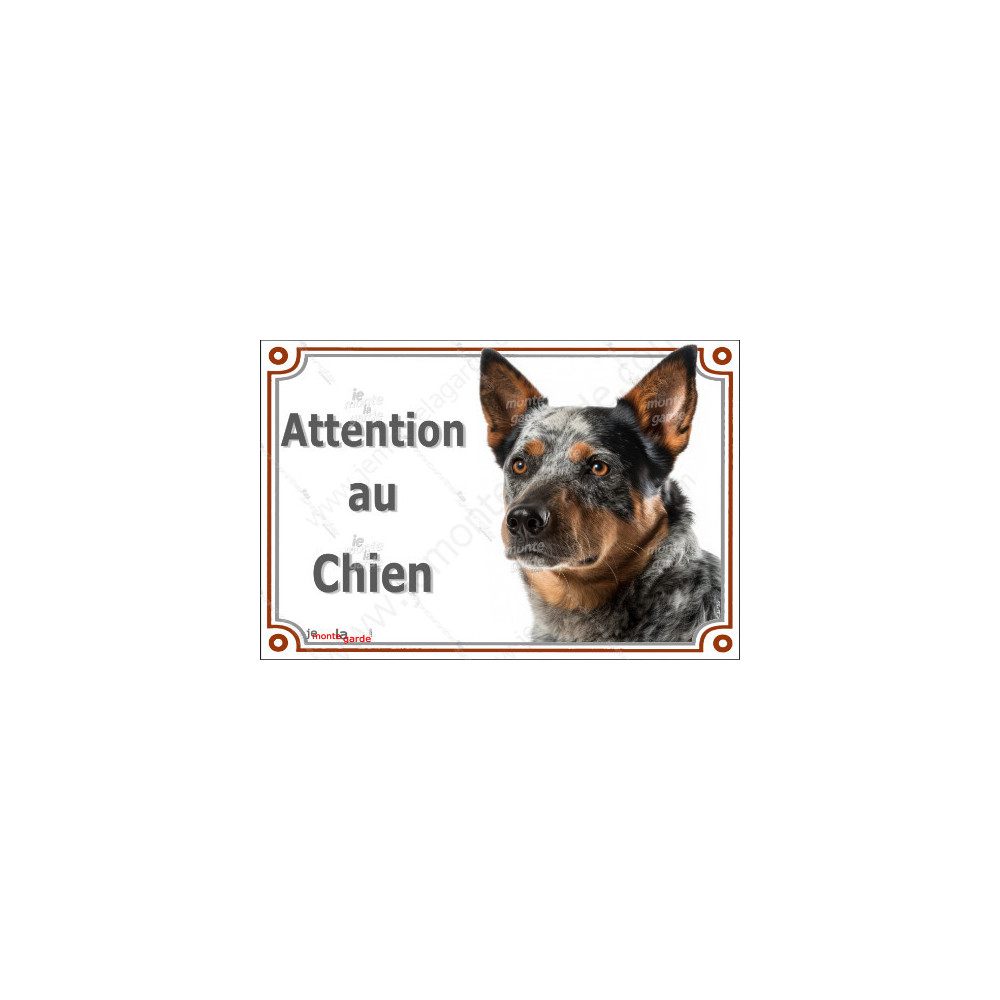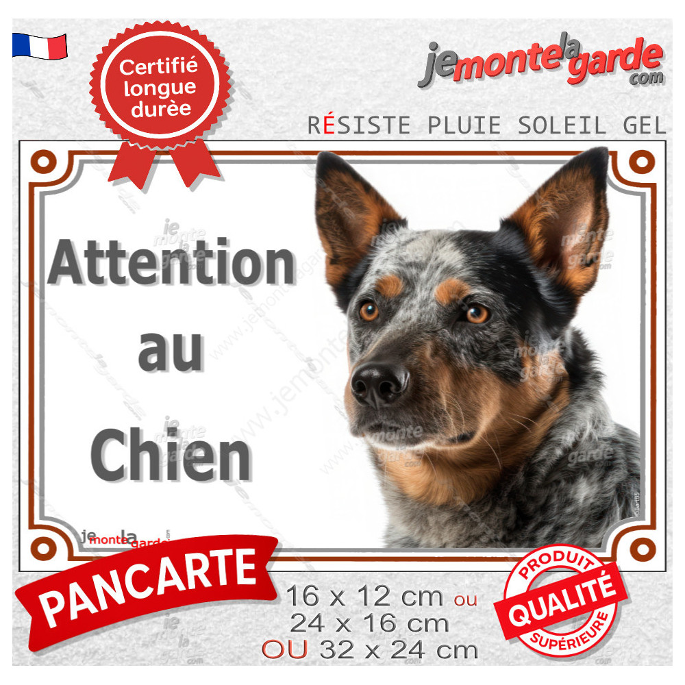 Pancarte au message clair “Attention au Chien”, illustrée par un Bouvier Australien bleu moucheté. Ce panneau résistant et lisible de loin combine esthétique, dissuasion discrète et clin d’œil élégant pour les passionnés de cette race unique.