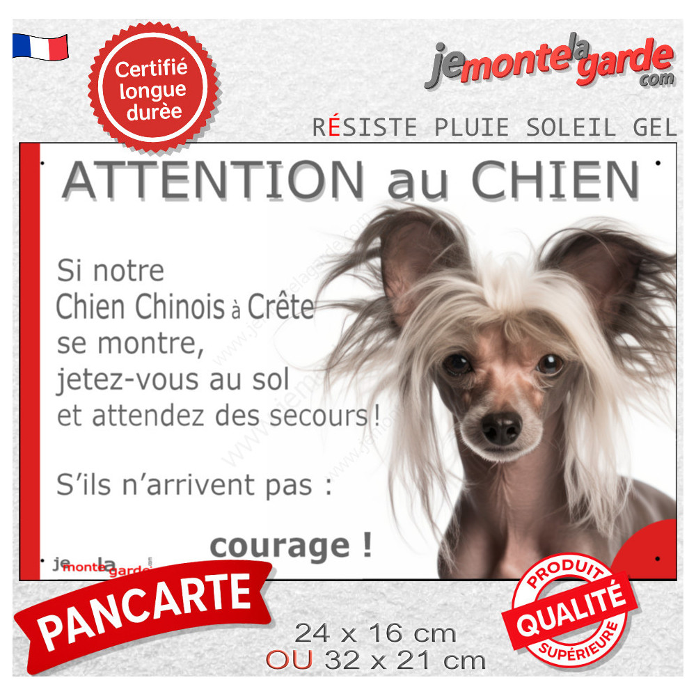 Texte | "Attention au chien : Si notre Chien Chinois à Crête se montre, jetez-vous au sol et attendez des secours ! S'ils n'arrivent pas : courage !" |
