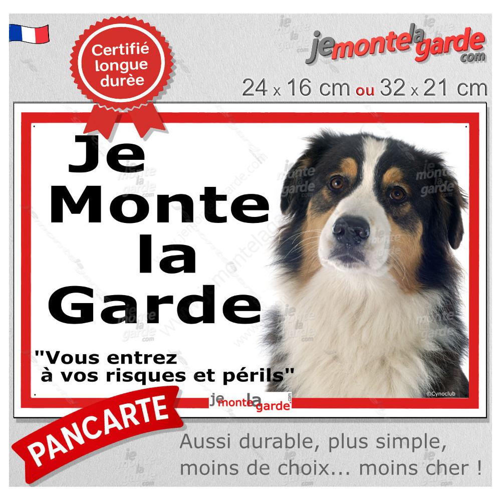 Petite dépense, grande utilité : plaque fabriquée en France affiche une photo claire d’un Berger Australien tricolore noir et le message « Je monte la garde, vous entrez à vos risques et périls ». Moins chère, moins de choix, elle reste durable, lisible, et résistante aux intempéries. Simple, utile, sans surplus.