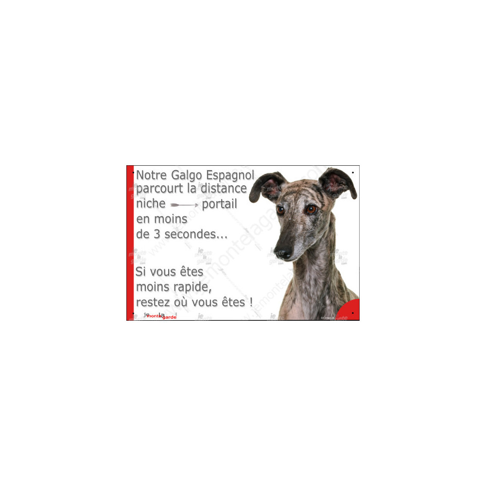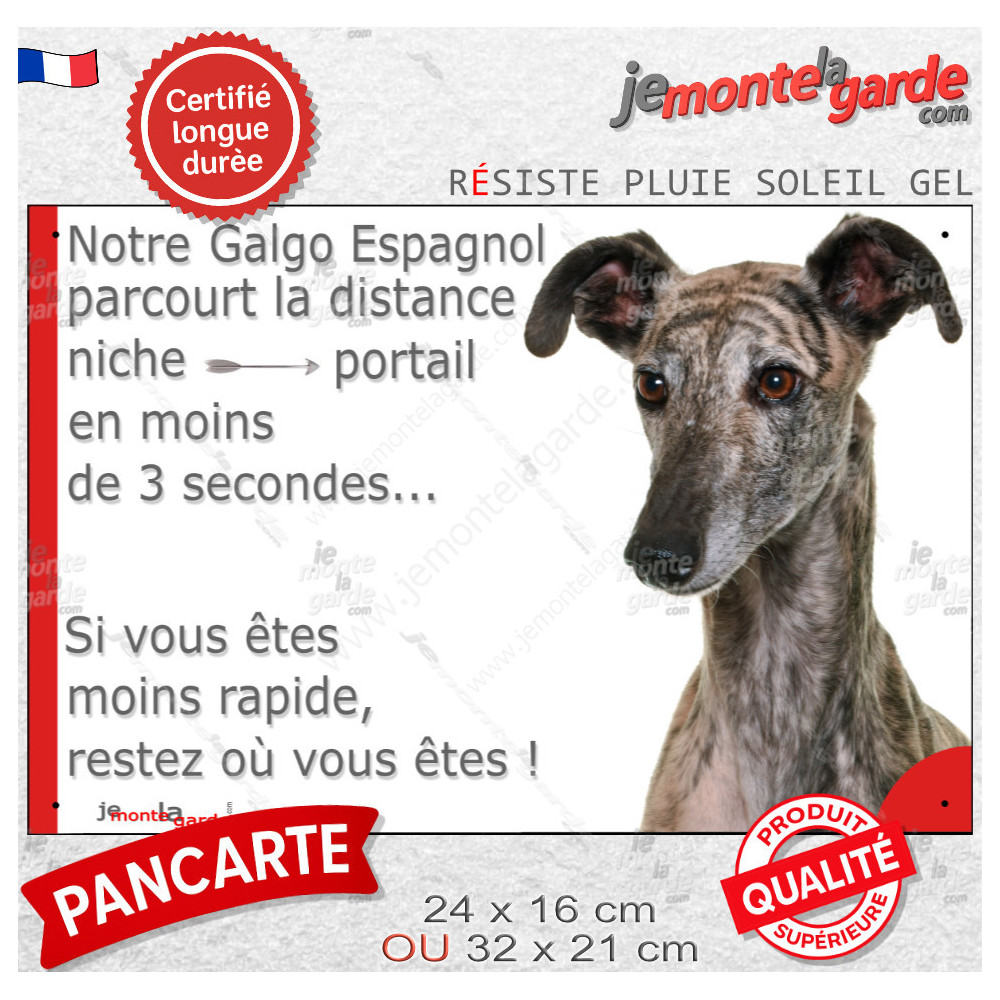 Panneau humoristique orné d’un Lévrier Galgo Espagnol bringé au regard expressif, imprimé en France sur matériau extérieur. Il indique : “Notre Galgo Espagnol parcourt la distance niche-portail en moins de 3 secondes… Si vous êtes moins rapide, restez où vous êtes !” Un message clair qui fait sourire et réfléchir.