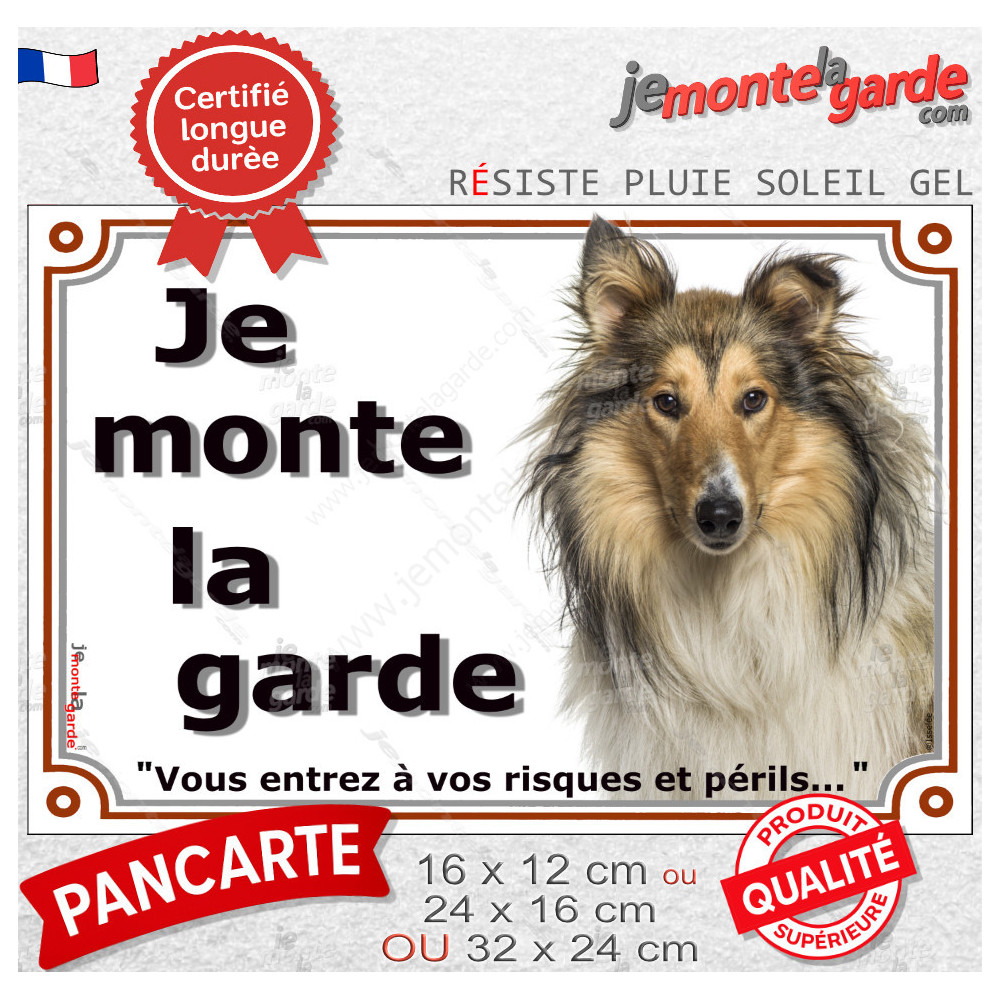 Plaque “Je monte la garde, vous entrez à vos risques et périls” avec photo du Colley fauve et blanc, fabriquée en France. Résistante à la pluie, au soleil et au gel, elle assure sécurité et sérénité, tout en étant un cadeau original et pratique pour toute entrée.