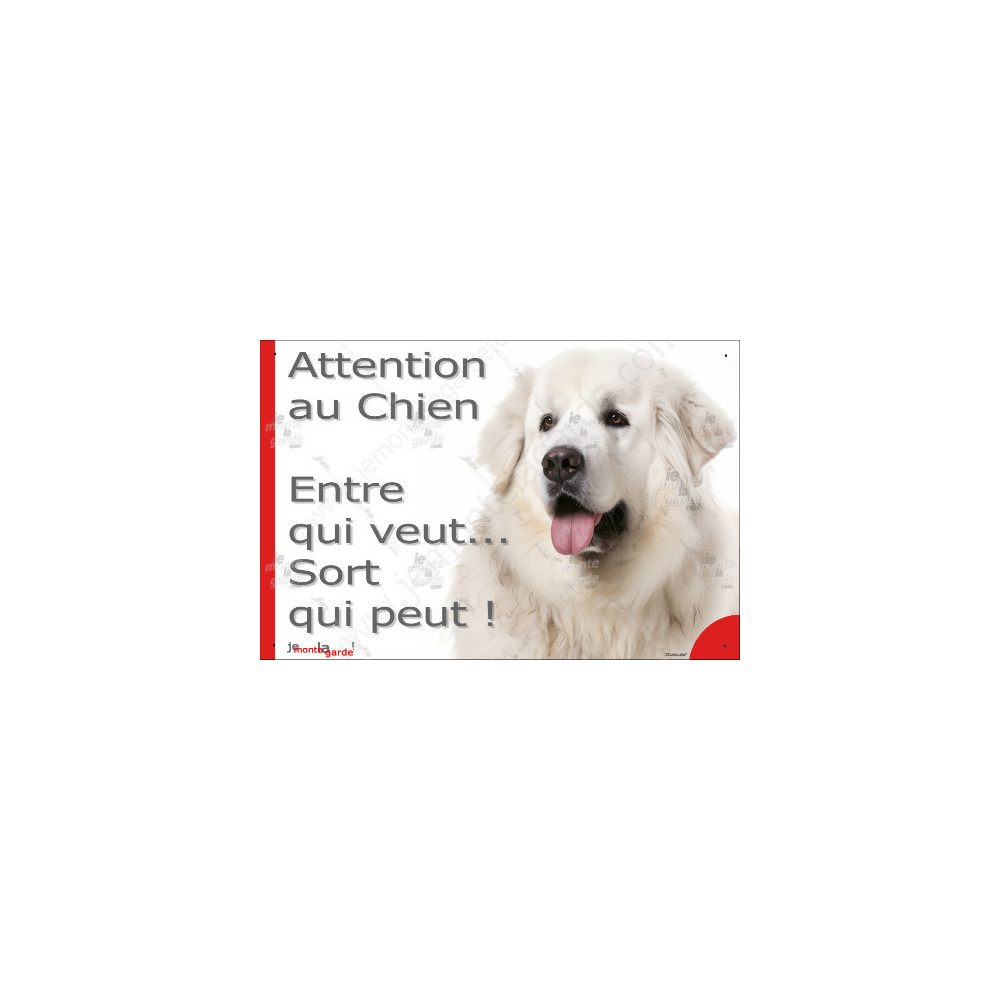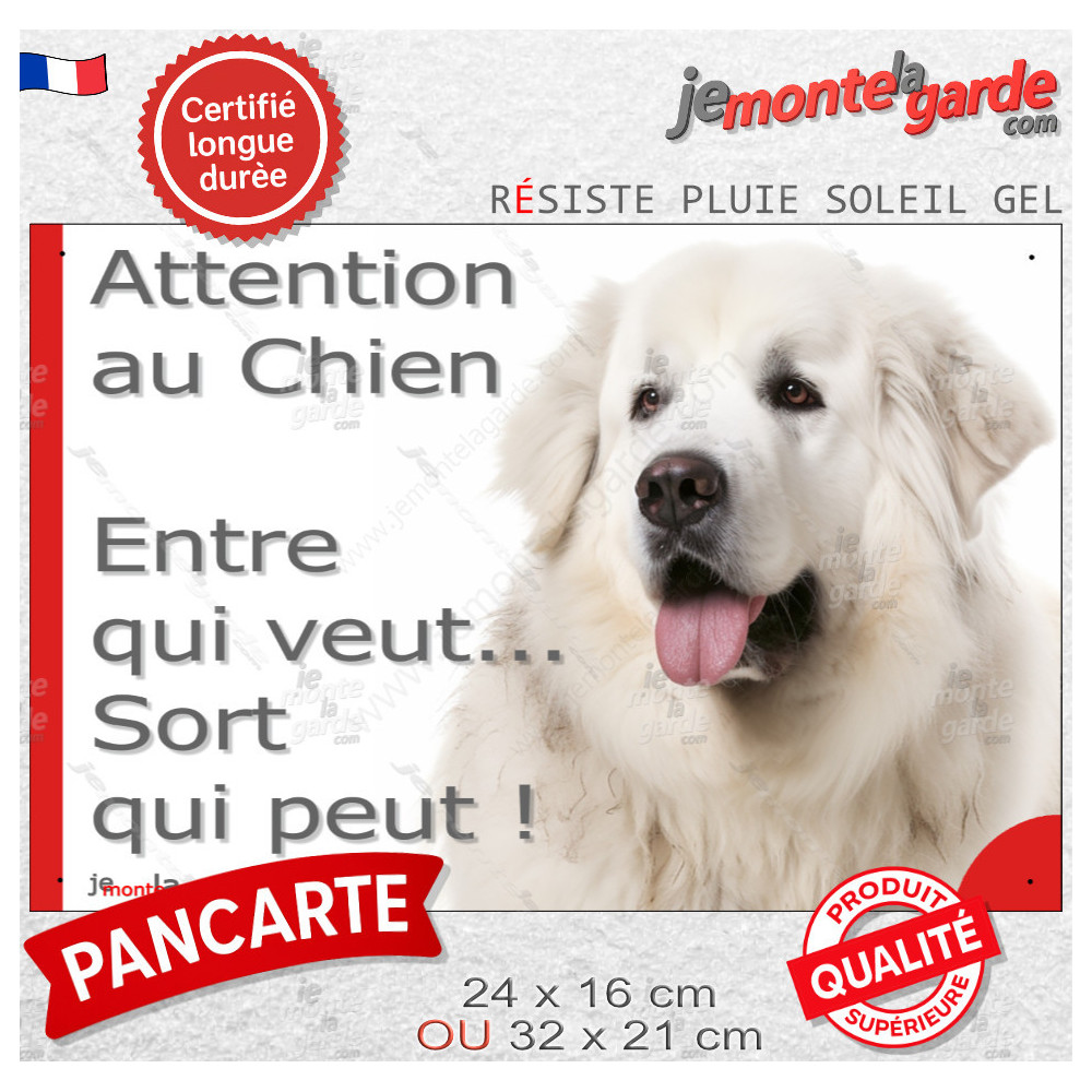 “Attention au Chien, entre qui veut, sort qui peut…” figure sur cette plaque de portail drôle et pleine de caractère, illustrée par un Montagne des Pyrénées au pelage blanc éclatant. Ce panneau d’entrée, aussi amusant qu’avertisseur, se distingue par un design clair, simple à lire et mémorable, même de loin.