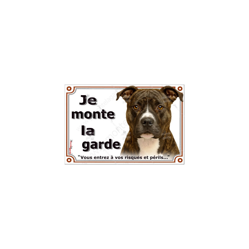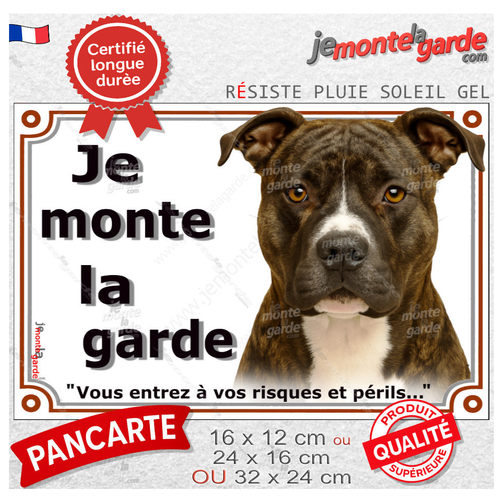 Plaque de portail “Je monte la garde, vous entrez à vos risques et périls” avec un American Staffordshire Terrier bringé. Fabrication française, encres et matériaux durables. Un panneau résistant au gel, à la pluie et au soleil. Idéal pour dissuader poliment sans agressivité.