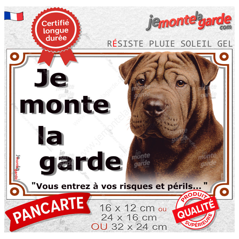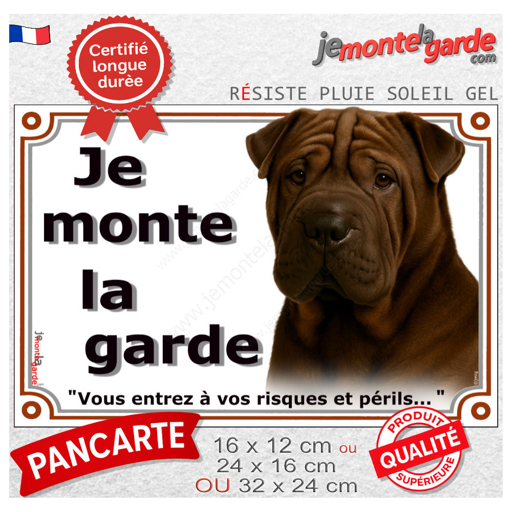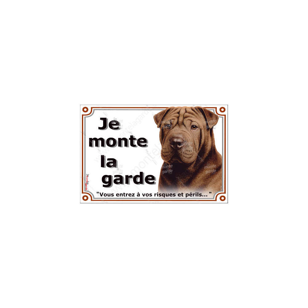 Plongez dans l'univers de la sécurité avec cette pancarte de portail "Je monte la garde, vous entrez à vos risques et périls", accompagnée d'une image captivante d'un Shar-Peï marron chocolat. Cette pancarte est bien plus qu'un simple avertissement, c'est une déclaration audacieuse de protection pour votre domicile.