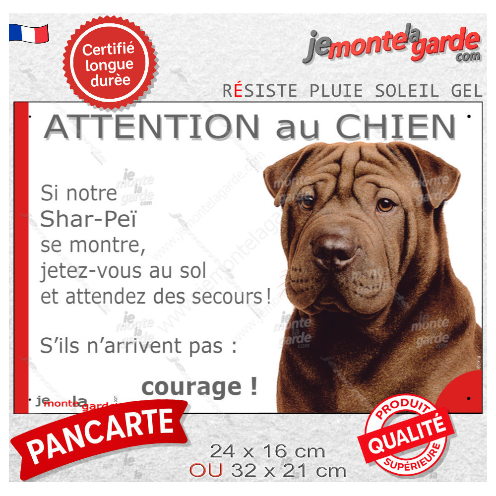 Découvrez la pancarte de portail la plus amusante et sécurisante pour votre maison : "Attention au chien : Si notre Shar-Peï se montre, jetez-vous au sol et attendez des secours ! S'ils n'arrivent pas: courage !" Dotée d'une photo saisissante d'un Shar-Peï noir, cette pancarte est une combinaison parfaite de protection et d'humour.