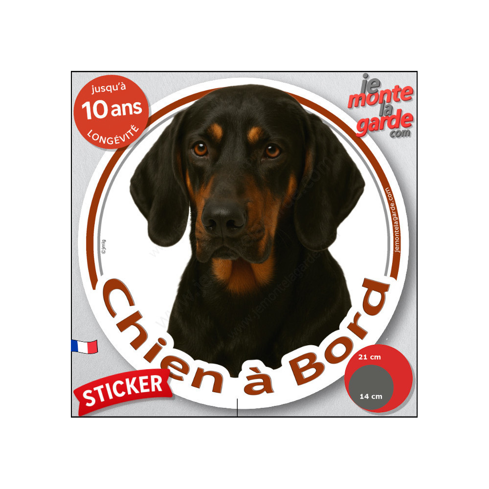 Un disque autocollant rond, disponible en 2 tailles, à coller à l'arrière de votre voiture pour prévenir de la présence de votre Bruno du Jura noir et feu.
