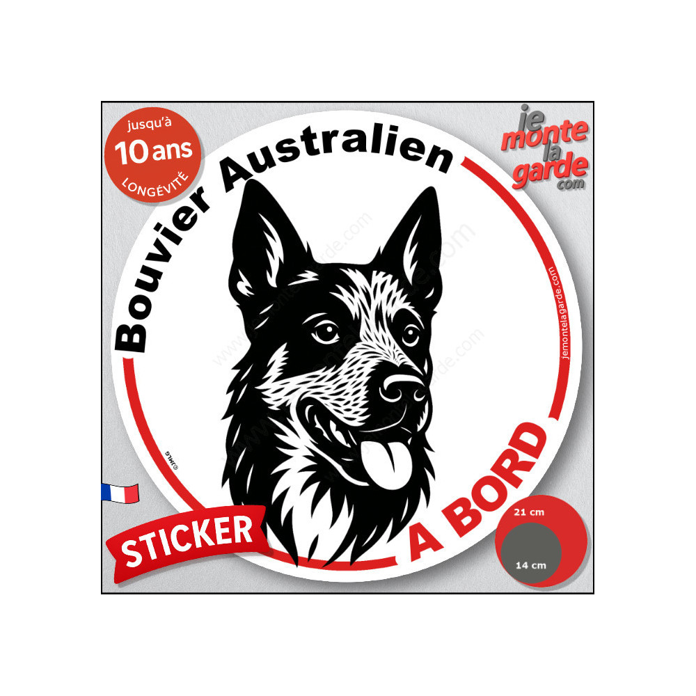 Un disque autocollant rond, disponible en 2 tailles, à coller à l'arrière de votre voiture pour prévenir de la présence de votre Bouvier Australien.