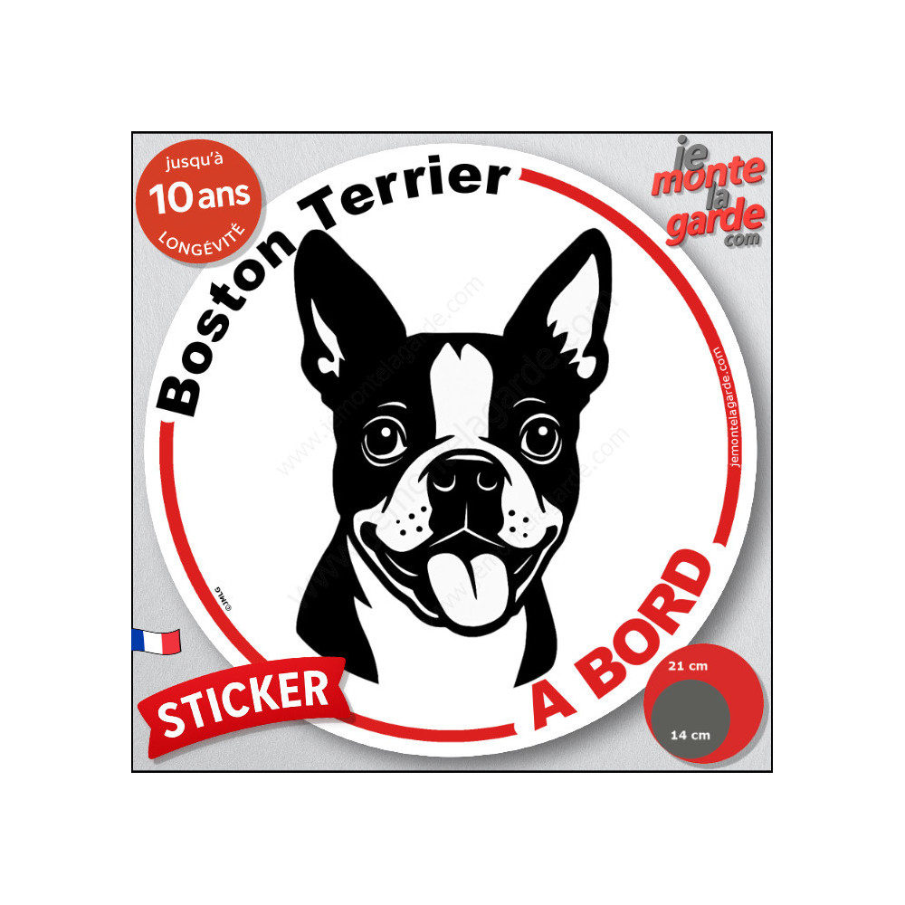 Un disque autocollant rond, disponible en 2 tailles, à coller à l'arrière de votre voiture pour prévenir de la présence de votre Boston Terrier.