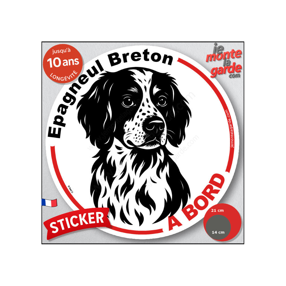 Un disque autocollant rond, disponible en 2 tailles, à coller à l'arrière de votre voiture pour prévenir de la présence de votre Epagneul Breton.