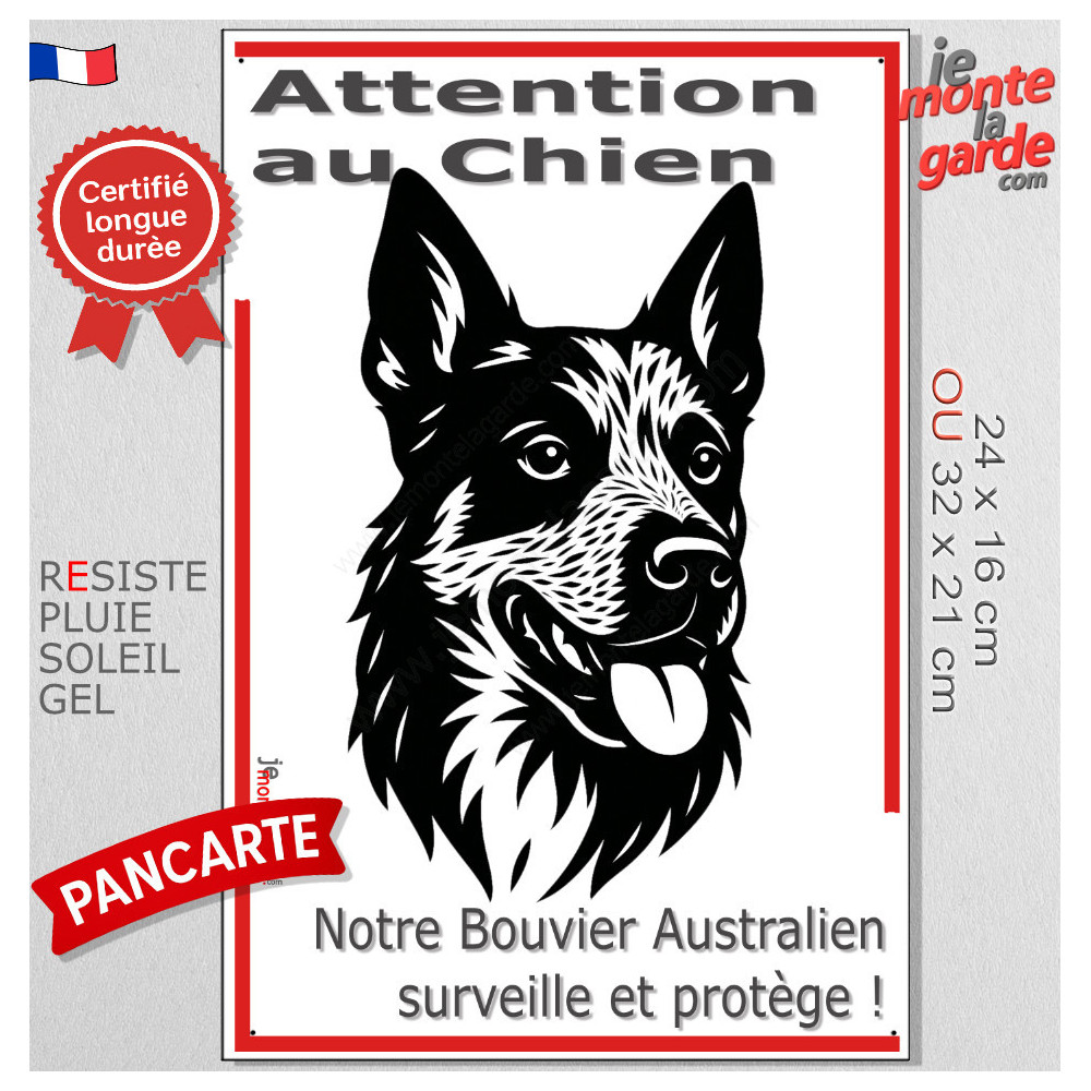 Plaque verticale “Attention au Chien, merci de ne pas entrer sans autorisation” avec silhouette d’un Bouvier Australien en noir et blanc, très stylisée. Idéale pour poteau ou portail étroit, cette pancarte résistante au soleil, à la pluie et au gel permet de dissuader les intrus, d’éviter les fuites et de gérer les visiteurs avec calme, respect et sécurité dès l’entrée.