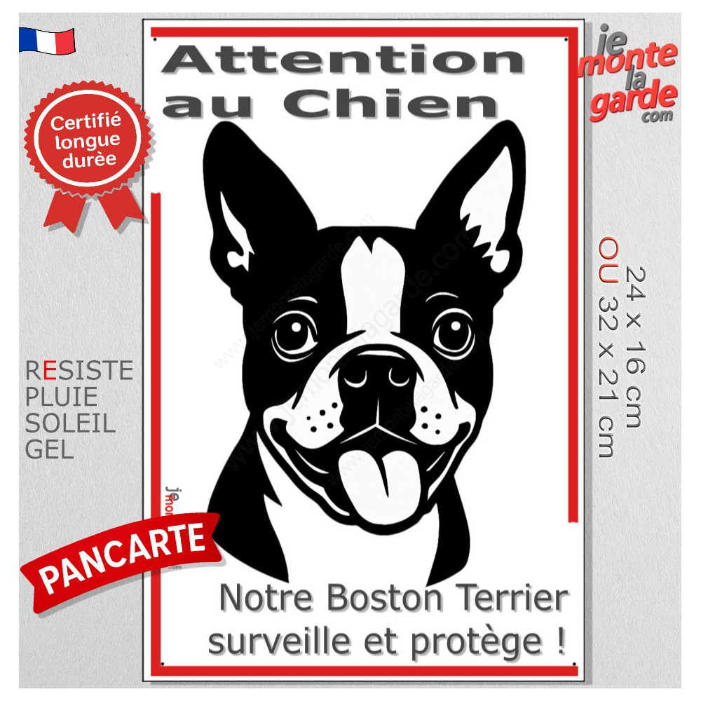 Plaque verticale “Attention au Chien, merci de ne pas entrer sans autorisation” avec silhouette d’un Boston Terrier en noir et blanc, très stylisée. Idéale pour poteau ou portail étroit, cette pancarte résistante au soleil, à la pluie et au gel permet de dissuader les intrus, d’éviter les fuites et de gérer les visiteurs avec calme, respect et sécurité dès l’entrée.