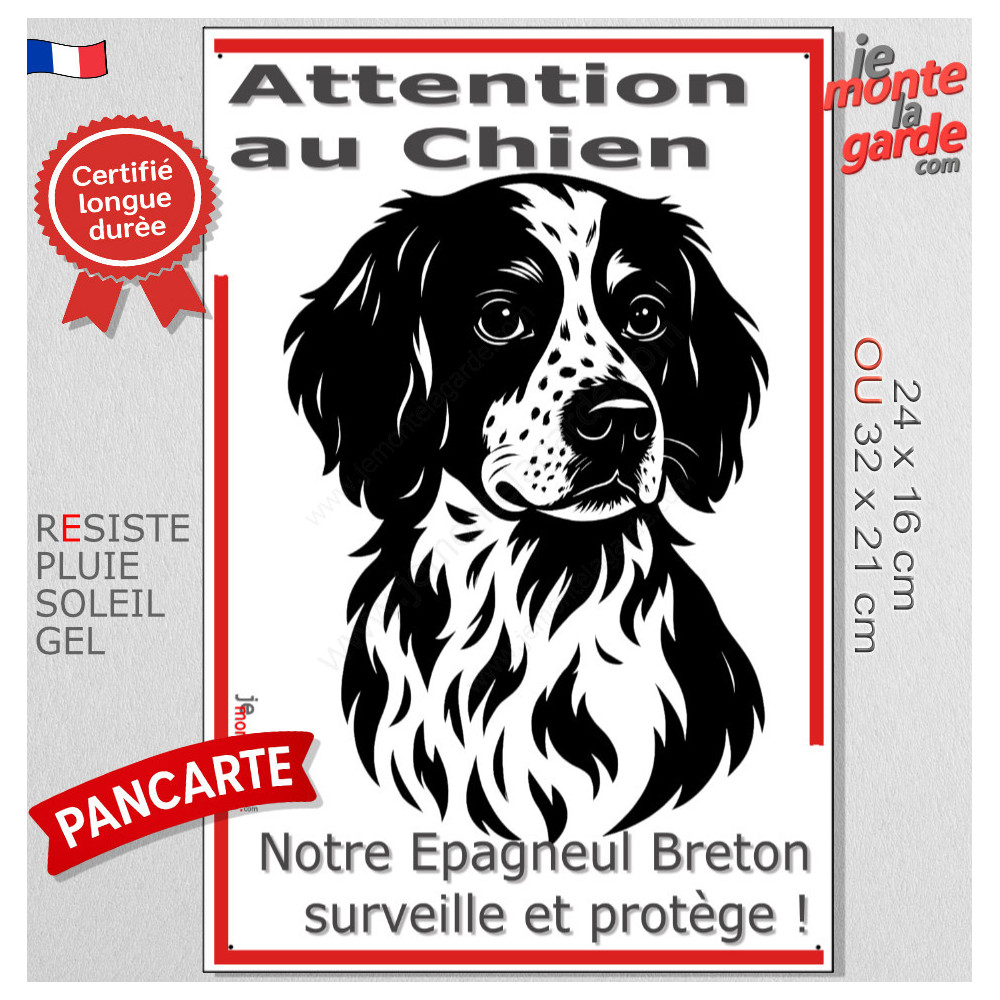 Plaque verticale “Attention au Chien, merci de ne pas entrer sans autorisation” avec silhouette d’un Epagneul Breton en noir et blanc, très stylisée. Idéale pour poteau ou portail étroit, cette pancarte résistante au soleil, à la pluie et au gel permet de dissuader les intrus, d’éviter les fuites et de gérer les visiteurs avec calme, respect et sécurité dès l’entrée.