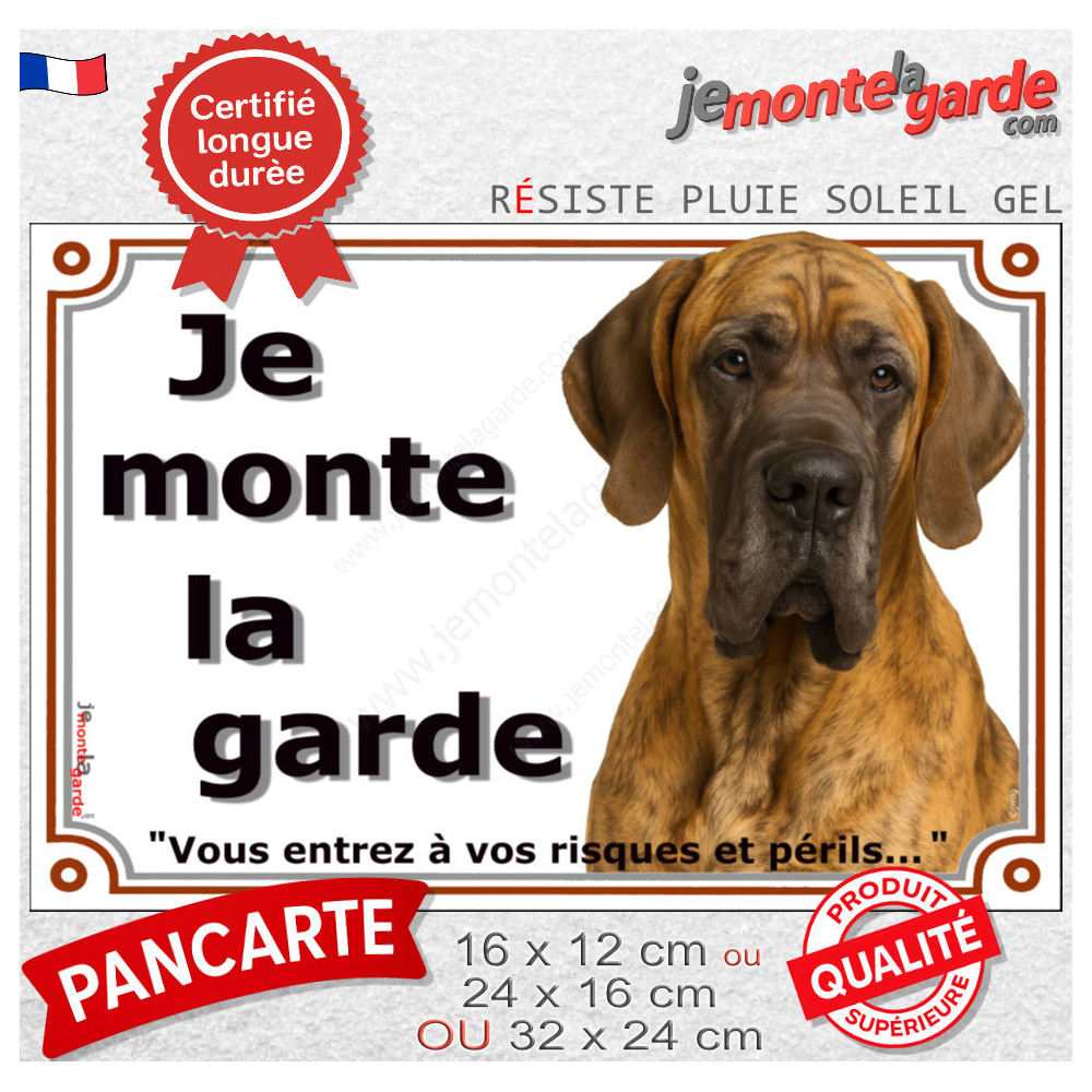 Cette plaque "Je monte la garde, vous entrez à vos risques et périls" avec un Dogue Allemand bringé, résistante aux intempéries, dissuade subtilement les visiteurs. Fabriquée en France, elle protège efficacement tout en étant un cadeau idéal pour les fans de cette race.