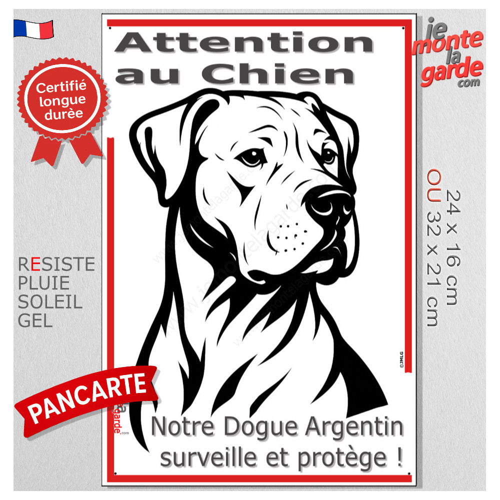 Plaque verticale “Attention au Chien, merci de ne pas entrer sans autorisation” avec silhouette d’un Dogue Argentin en noir stylisée. Idéale pour poteau ou portail étroit, pancarte résistante au soleil, à la pluie et au gel pour dissuader les intrus, éviter les fuites et gérer les visiteurs avec respect et sécurité.