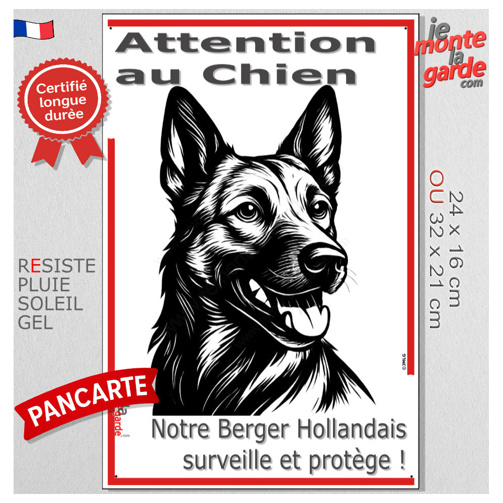 Plaque verticale “Attention au Chien, merci de ne pas entrer sans autorisation” avec silhouette d’un Berger Hollandais en noir stylisé. Idéale pour poteau ou portail étroit, résiste au soleil, à la pluie et au gel pour dissuader les intrus, éviter les fuites et gérer les visiteurs avec respect et sécurité.
