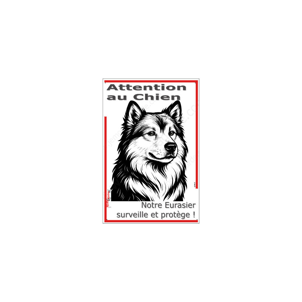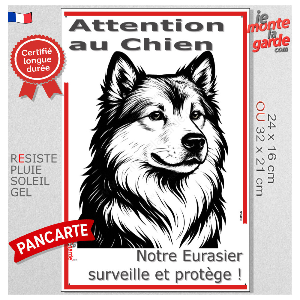 Plaque verticale “Attention au Chien, merci de ne pas entrer sans autorisation” avec silhouette d’un Eurasier en noir et blanc stylisée. Idéale pour poteau ou portail étroit, résiste au soleil, à la pluie et au gel, dissuade les intrus, évite les fuites et gére les visiteurs avec respect et sécurité.