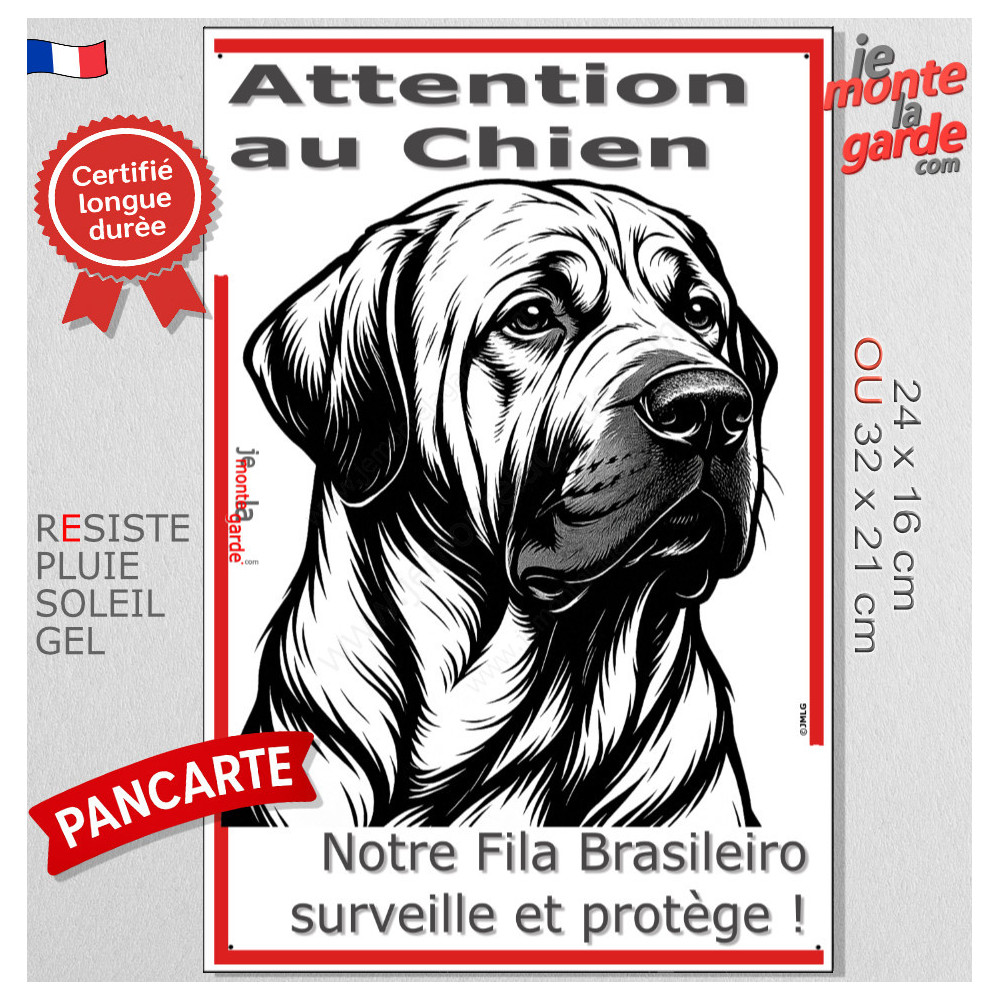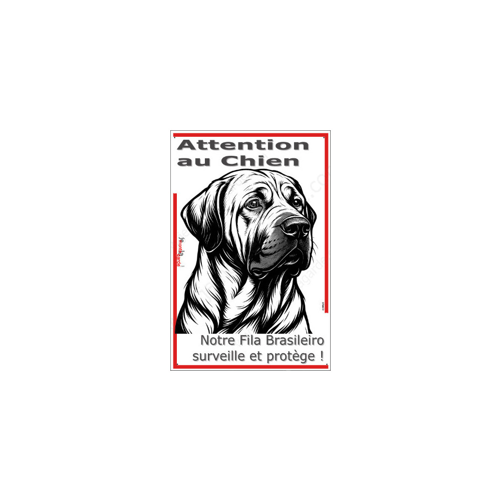 Plaque verticale “Attention au Chien, merci de ne pas entrer sans autorisation” avec silhouette d’un Fila Brasileiro en noir et blanc stylisée. Idéale pour poteau ou portail étroit, résiste au soleil, à la pluie et au gel, dissuade les intrus, évite les fuites et gére les visiteurs avec respect et sécurité.