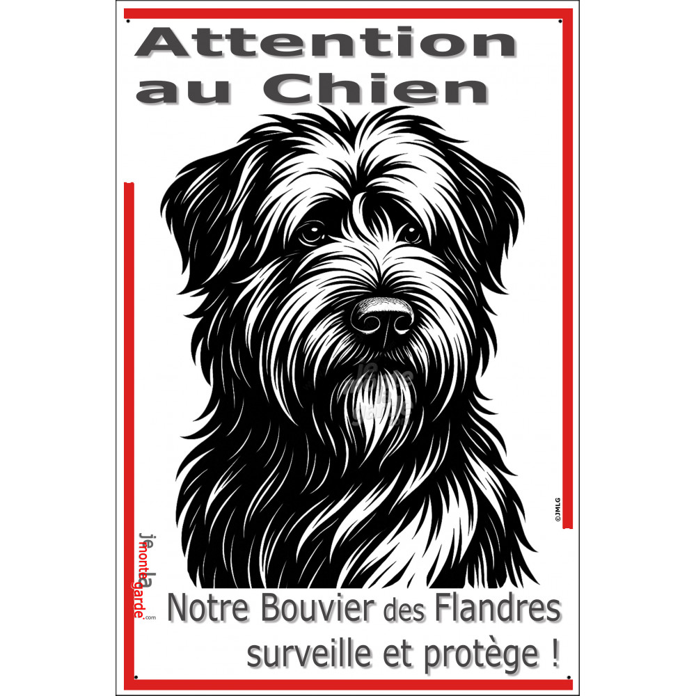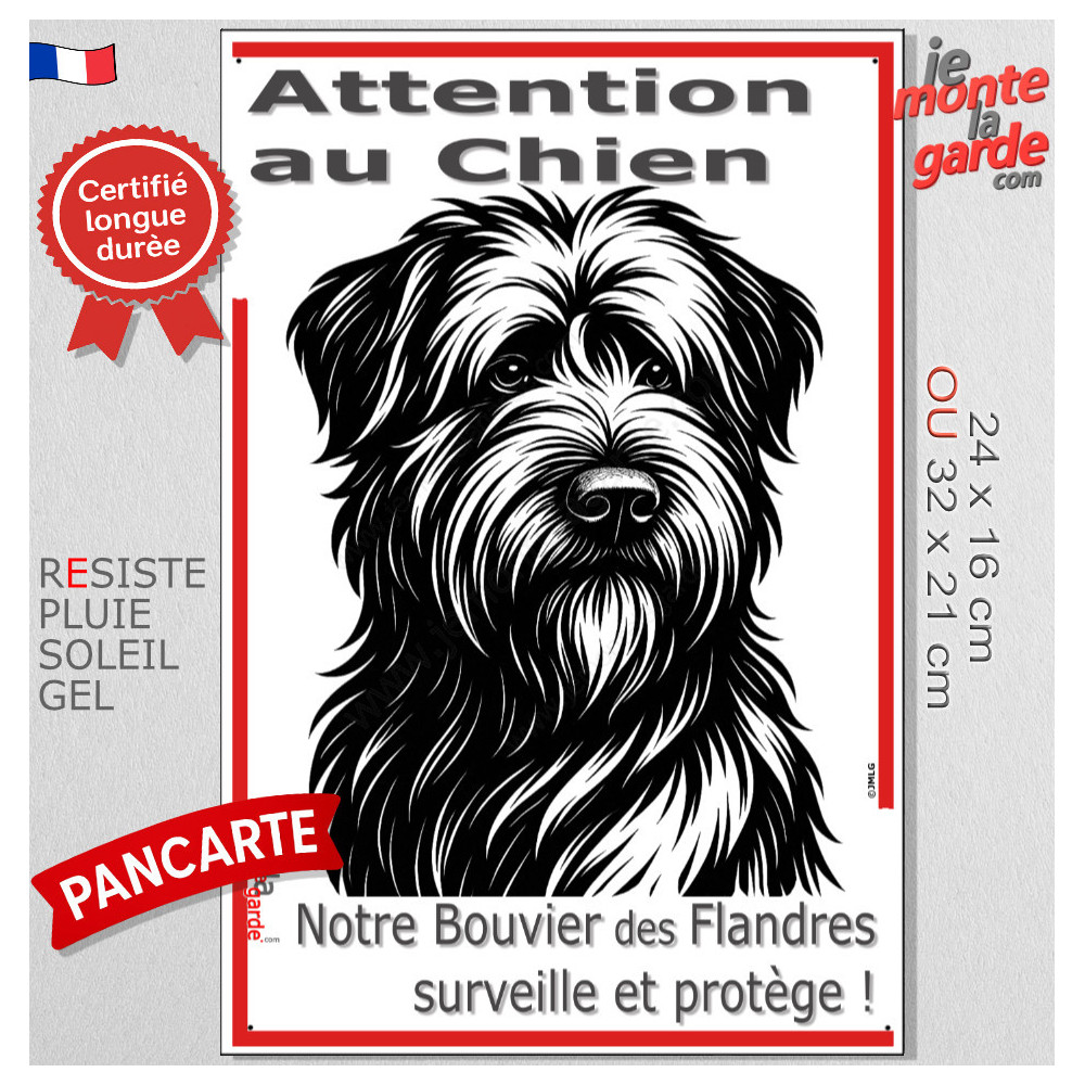 Plaque verticale “Attention au Chien, merci de ne pas entrer sans autorisation” avec silhouette d’un Bouvier des Flandres en noir et blanc stylisée. Idéale pour poteau ou portail étroit, résiste au soleil, à la pluie et au gel, dissuade les intrus, évite les fuites et gére les visiteurs avec respect et sécurité.