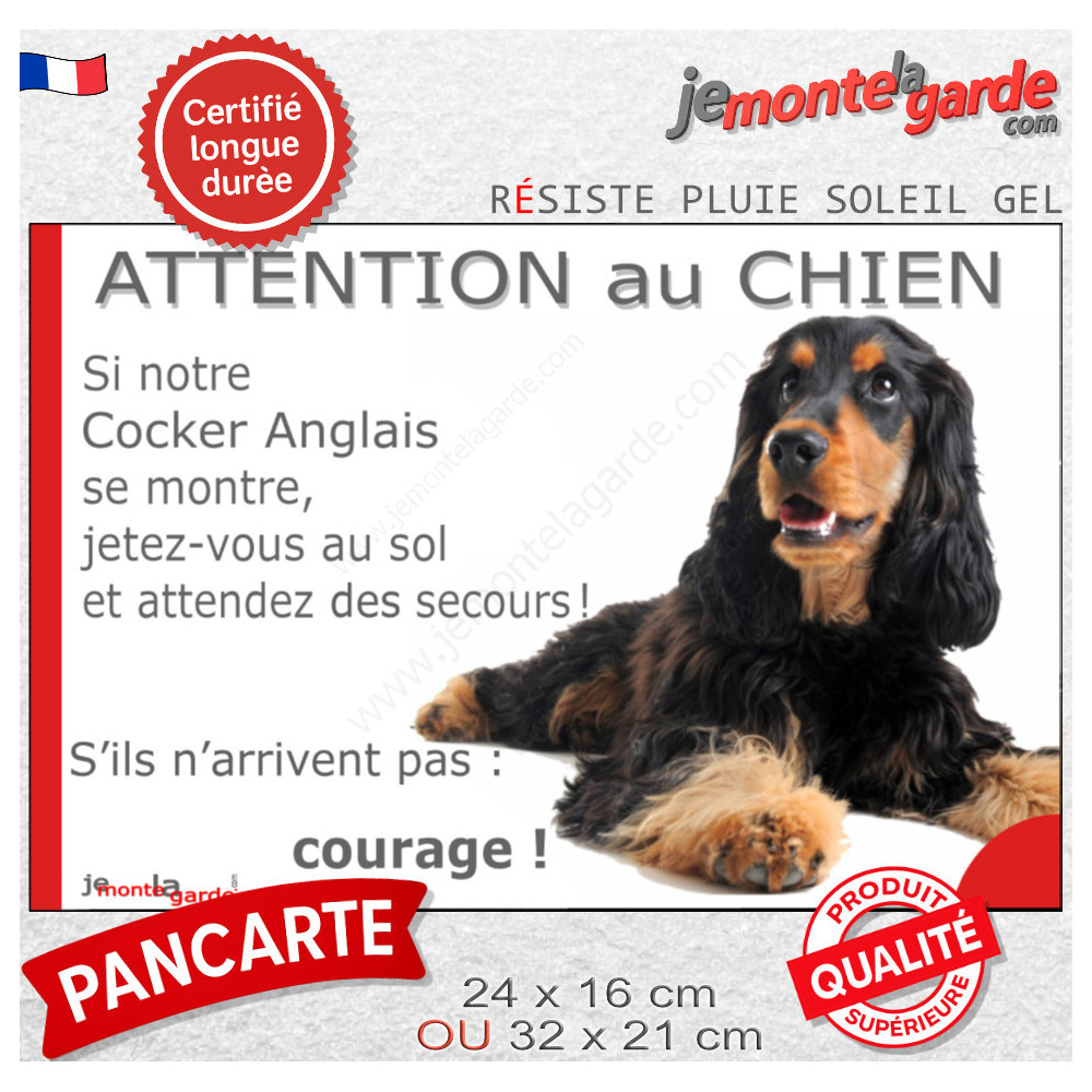 Amusez les passants, vos invités et... la galerie avec pancarte sur votre portail qui en plus mettra en valeur votre Cocker Anglais Spaniel noir et feu ? le message passera toujours mieux avec un peu d'humour !