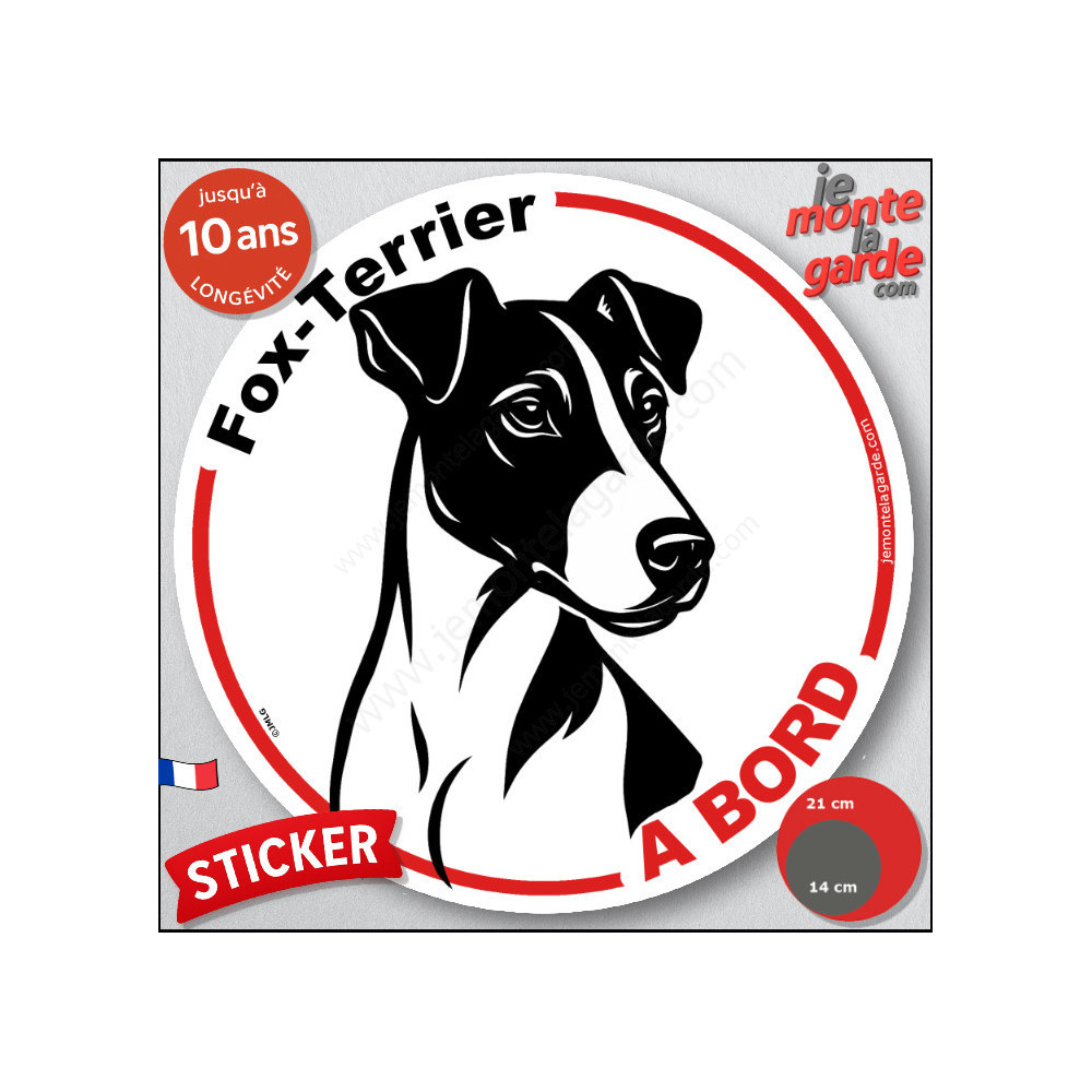 Un disque autocollant rond, disponible en 2 tailles, à coller à l'arrière de votre voiture pour prévenir de la présence de votre Fox-Terrier à poils lisses.