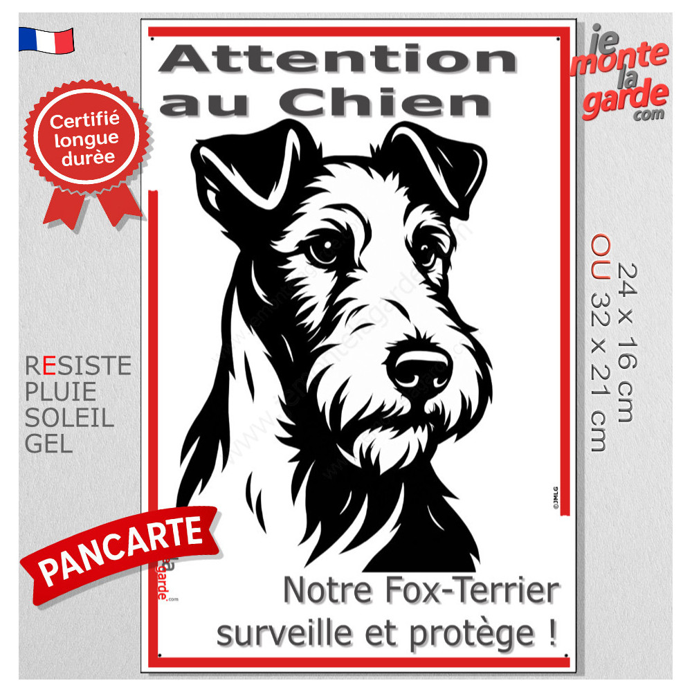 Plaque verticale “Attention au Chien, merci de ne pas entrer sans autorisation” avec silhouette d’un Fox-Terrier à poils durs en noir et blanc stylisée. Idéale pour poteau ou portail étroit, résiste au soleil, à la pluie et au gel, dissuade les intrus, évite les fuites et gére les visiteurs avec respect et sécurité.
