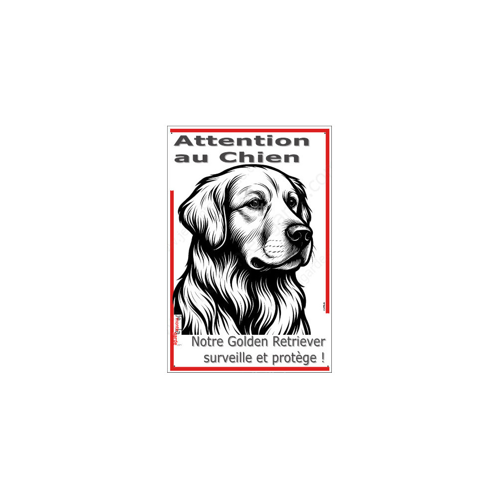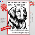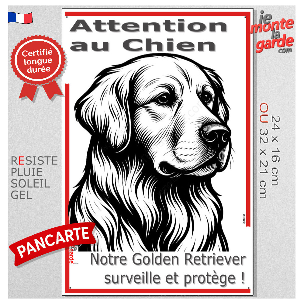 Plaque verticale “Attention au Chien, merci de ne pas entrer sans autorisation” avec silhouette d’un Golden Retriever en noir et blanc stylisée. Idéale pour poteau ou portail étroit, résiste au soleil, à la pluie et au gel, dissuade les intrus, évite les fuites et gére les visiteurs avec respect et sécurité.